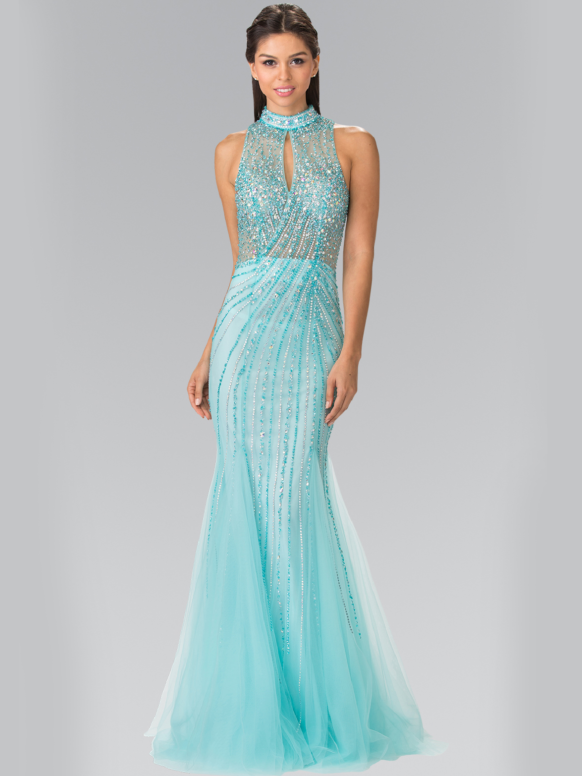 This stunning long prom dress features high neck with keyhole illusion bodice. Shimmery beads scattered throughout the dress with mermaid tulle hem completed the style. - Back zipper. - Mesh. - Approx. length 60" from shoulder to hem.