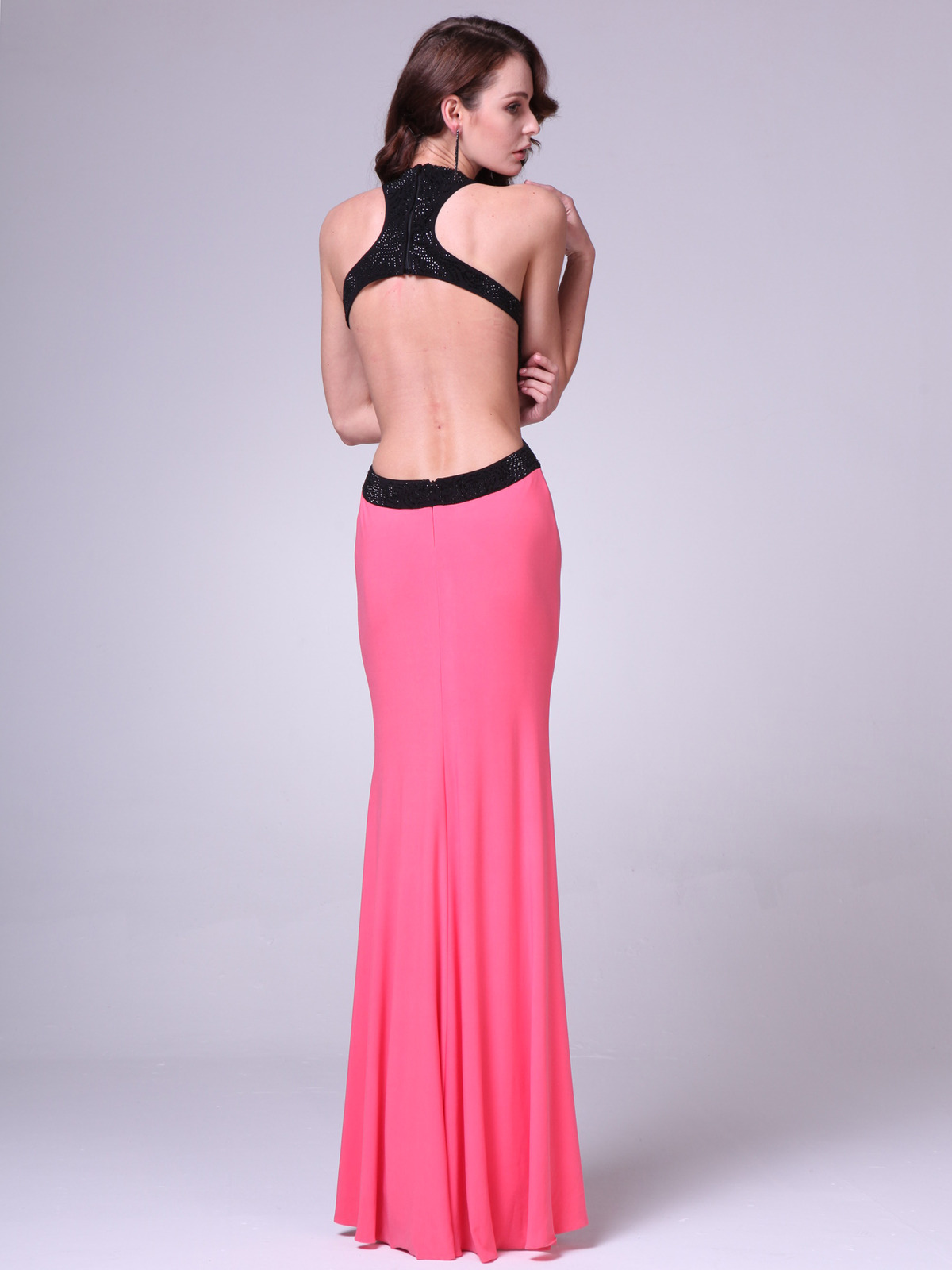 Beautiful soft jersey prom dress features black shimmering trim frame the bodice and the cutout waistline. Open back and slightly flared hip hugging floor length skirt with side slit give the design a fun and flirty touch. -Approximate 60 inches from shoulder to hem. -Zipper entry. -Fully lined. -Polyester. -Imported.
