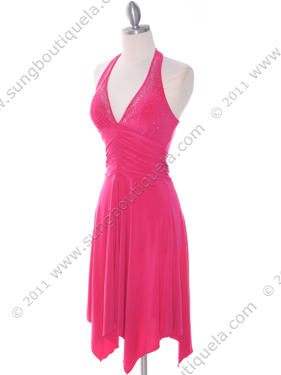 This beautiful halter party dress features sparkling beads detail the V-neckline. Shirred bodice, sweeping skirt finished with a four-point hankie hemline. Slip-on; no closures. Made in USA; Polyester/spandex.