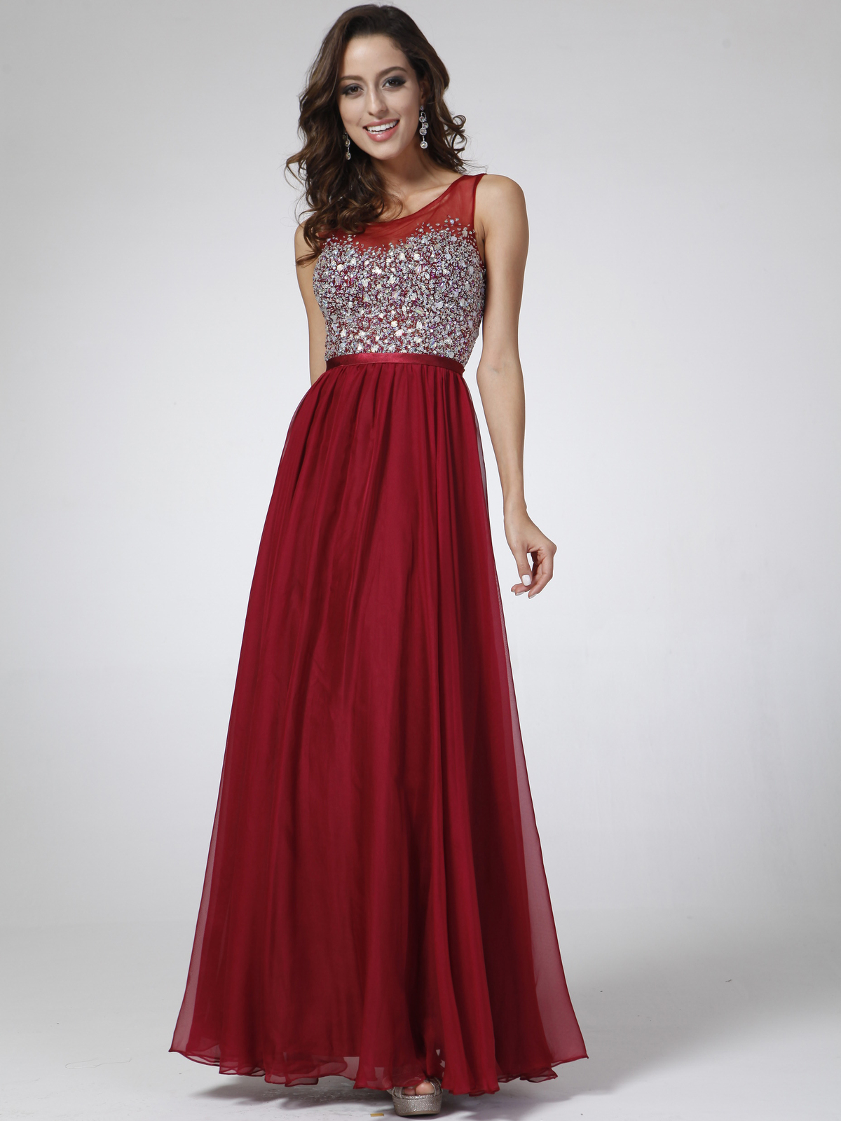 Brilliance beadwork details the sheer sleeveless bodice. Simple and classic layered floor length A-line skirt completed the look.