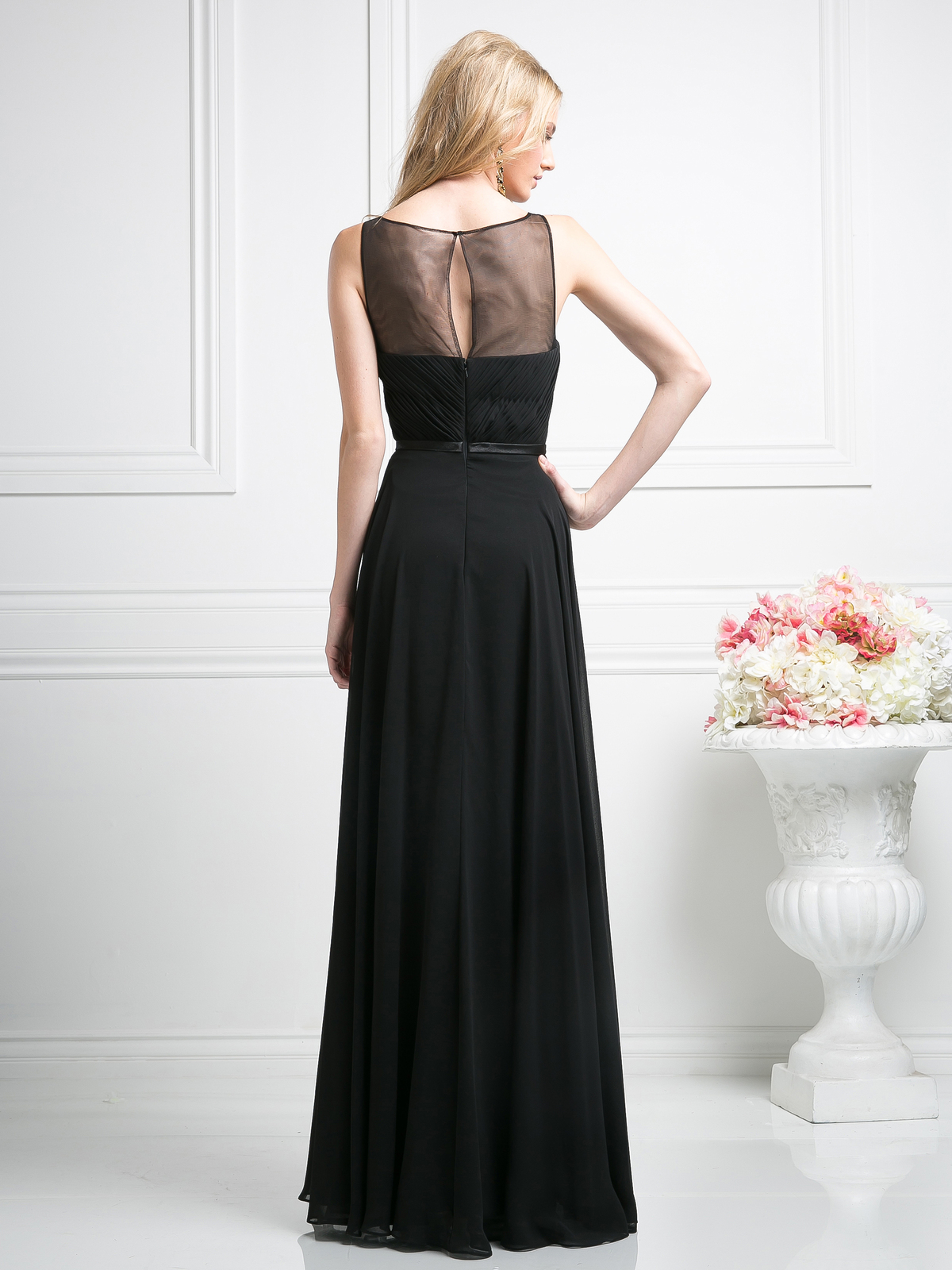 Plunging sweetheart neckline with an illusion overlay bodice and a thin belted waistline. Floor length skirt perfect for a sophisticated yet, posh evening.