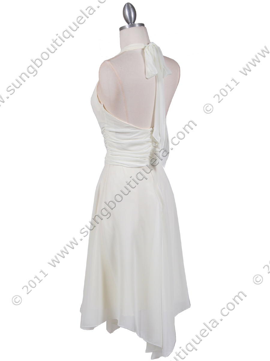 This daring V-neck halter cocktail dress features soft, fluid chiffon fabric with shirred bodice and a full, sweeping skirt finished with a four-point hankie hemline. Back center zipper. Made in USA; 100% polyester.