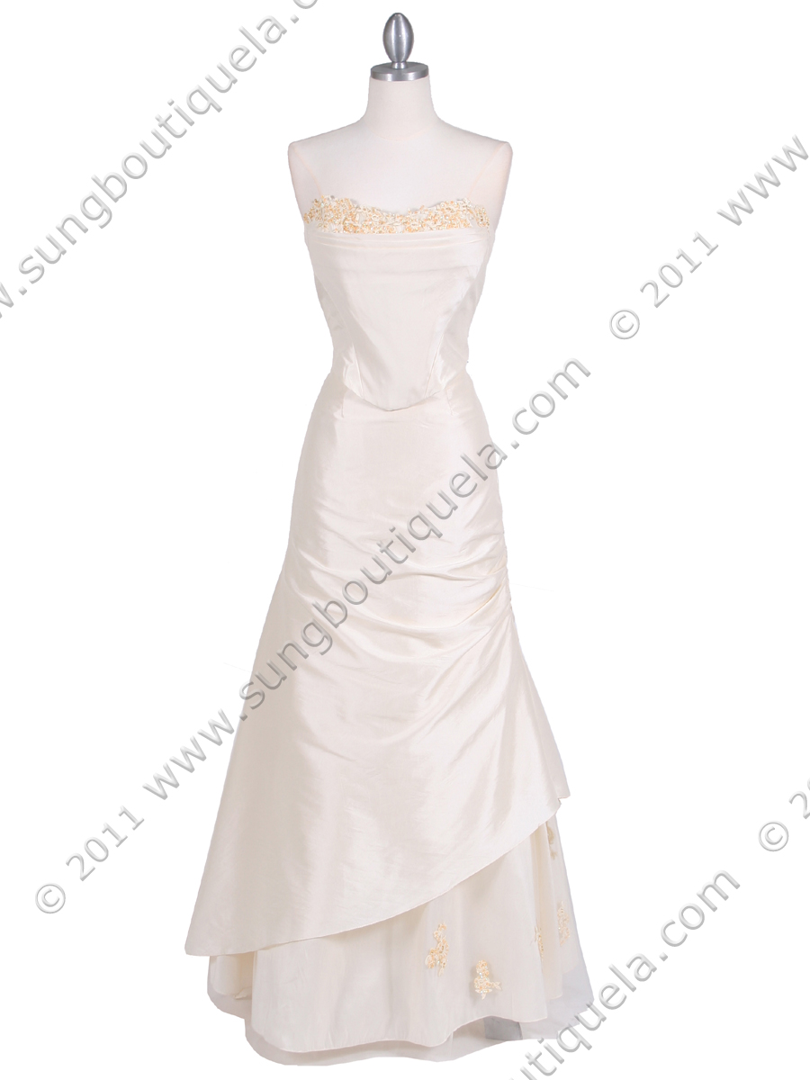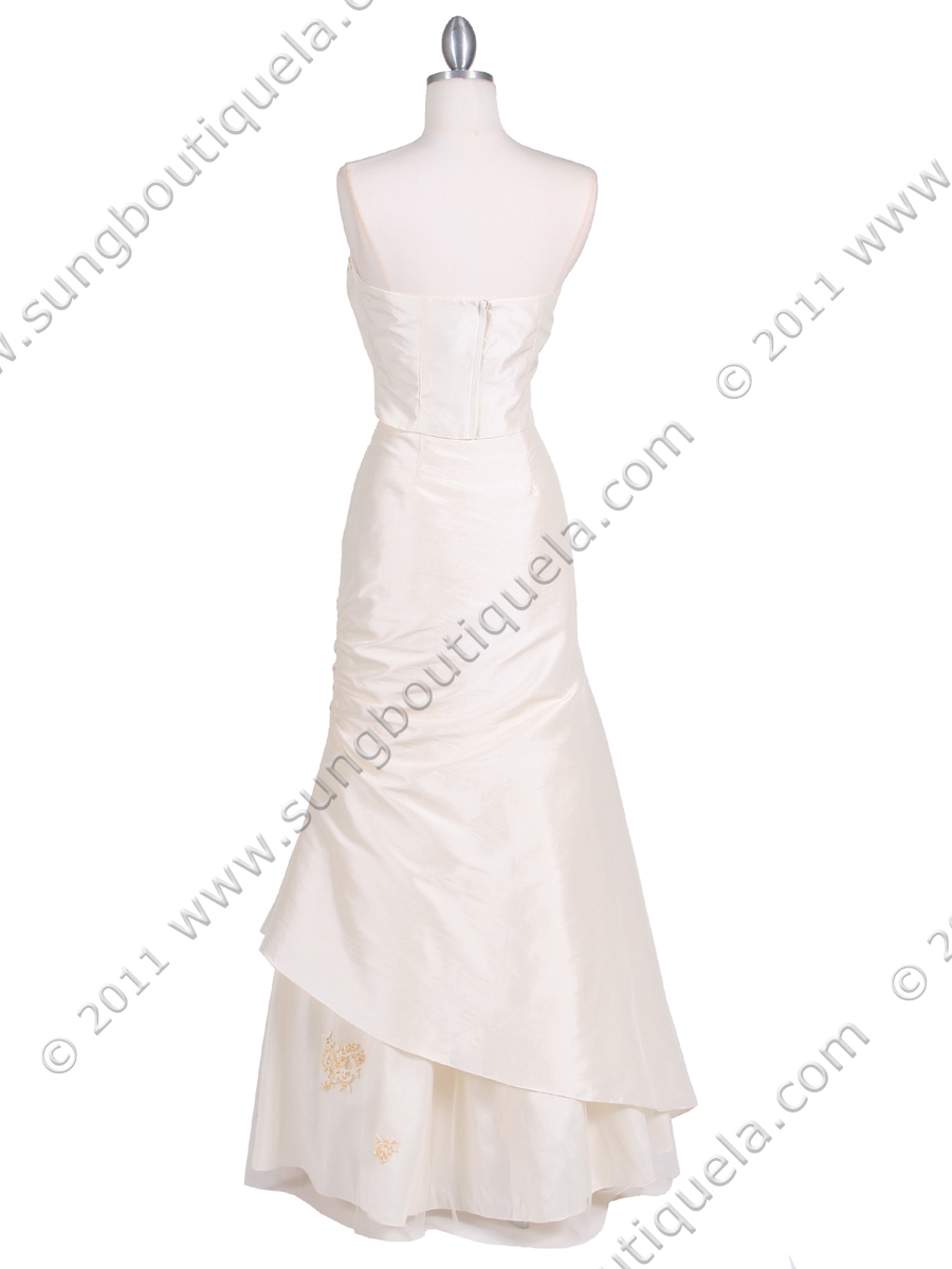 This elegant 2-piece evening gown features corset top with floral pattern lace with sparkly beads and sequins decorated around the sweetheart neckline. Ruched bodice and hips. Built-in boning at the bodice provides a secure fit. High low hem with same tone tulle with embroidery sequins and beads underlay. Elegant and sexy. -Imported. - Hidden back zipper.
