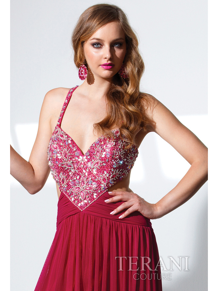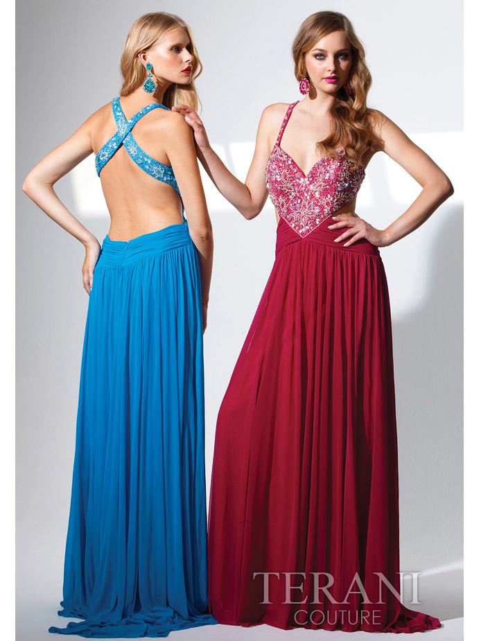 V-neckline with bodice and straps with a bead and stone d�cor. Pleats on the waist and floor length skirt. The look is complete with a train and an open back. -Zipper entry. -Approx. 68 inches from shoulder to hem. -Fully lined. -Polyester. -Imported.