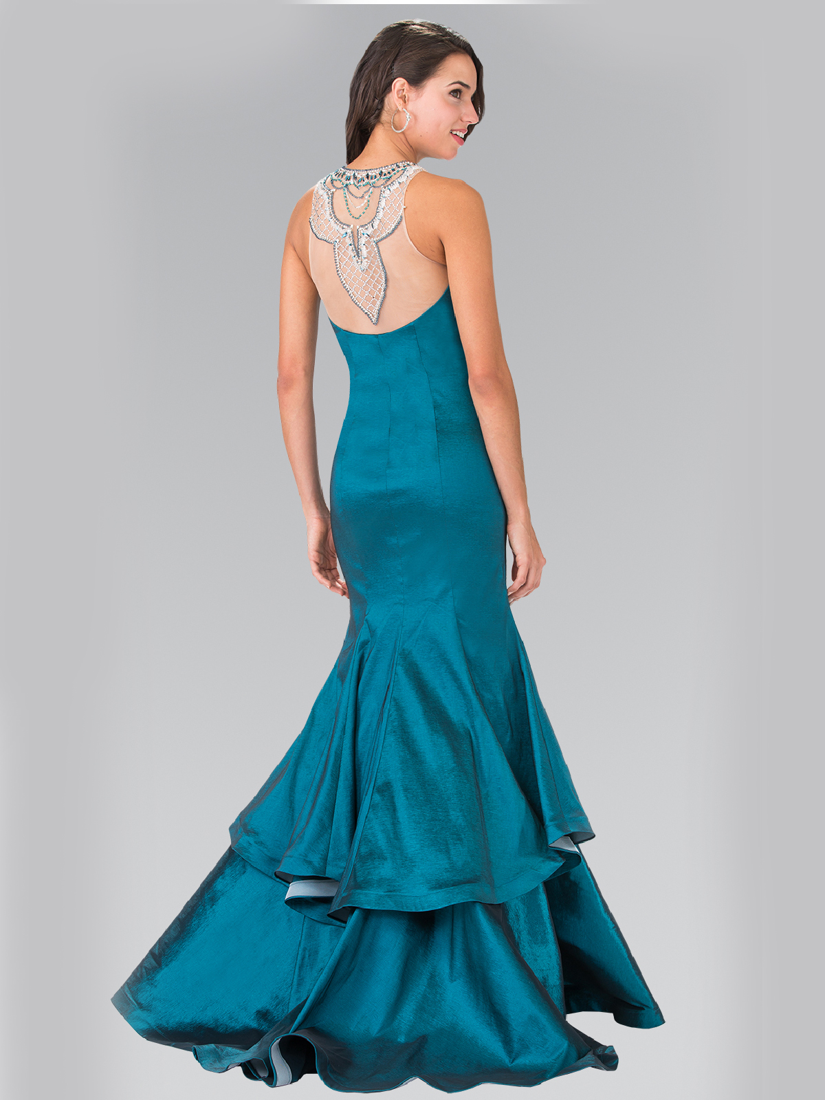 Gorgeous long prom dress features Jeweled Accented Neckline. Fitted bodice with two-tier taffeta floor length skirt adds elegant to the style. - Back zipper. - Padded bodice. - Fabric:Taffeta - Approx. length 61" from shoulder to hem. - Imported.