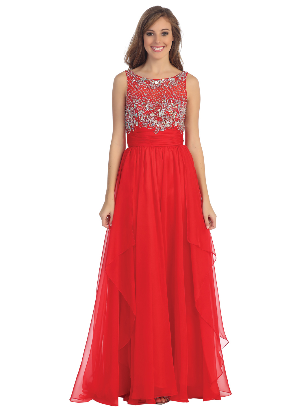 Embellished jewel and sequin detail the neckline and bodice. Pleated waist with soft draped floor sweeping chiffon skirt for a gorgeous silhouette. -Approx. 60 inches from shoulder to hem. -Fully lined. -Polyester. -Imported