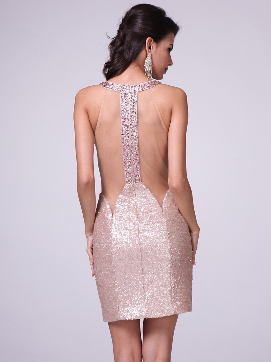This eye catching cocktail dress features sparkling jewel detailed the high neck and the sheer back. Sequin dress with thigh high mini skirt completed the glamorous look. -Approximate 34 inches from shoulder to hem. -Zipper back entry. -Fully lined. -Polyester. -Imported.