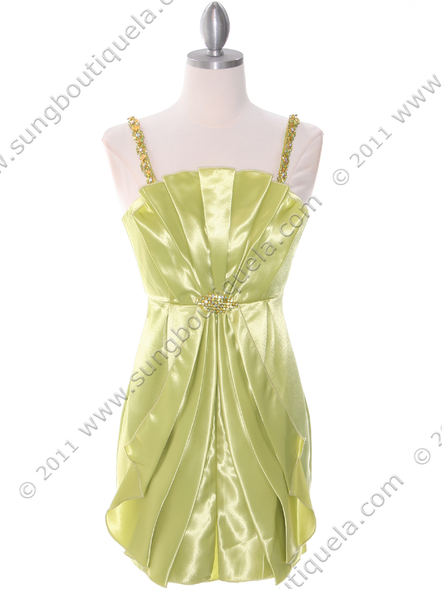 This stunning cocktail dress features jeweled straps and pleated neckline. Brooch detailing the waist and pleats following through the entire bodice finishes this fabulous look. - Back zipper. - Boned bodice for corset like support. - Approx. 31 in. from shoulder to hem. - 100% polyester. - Imported.