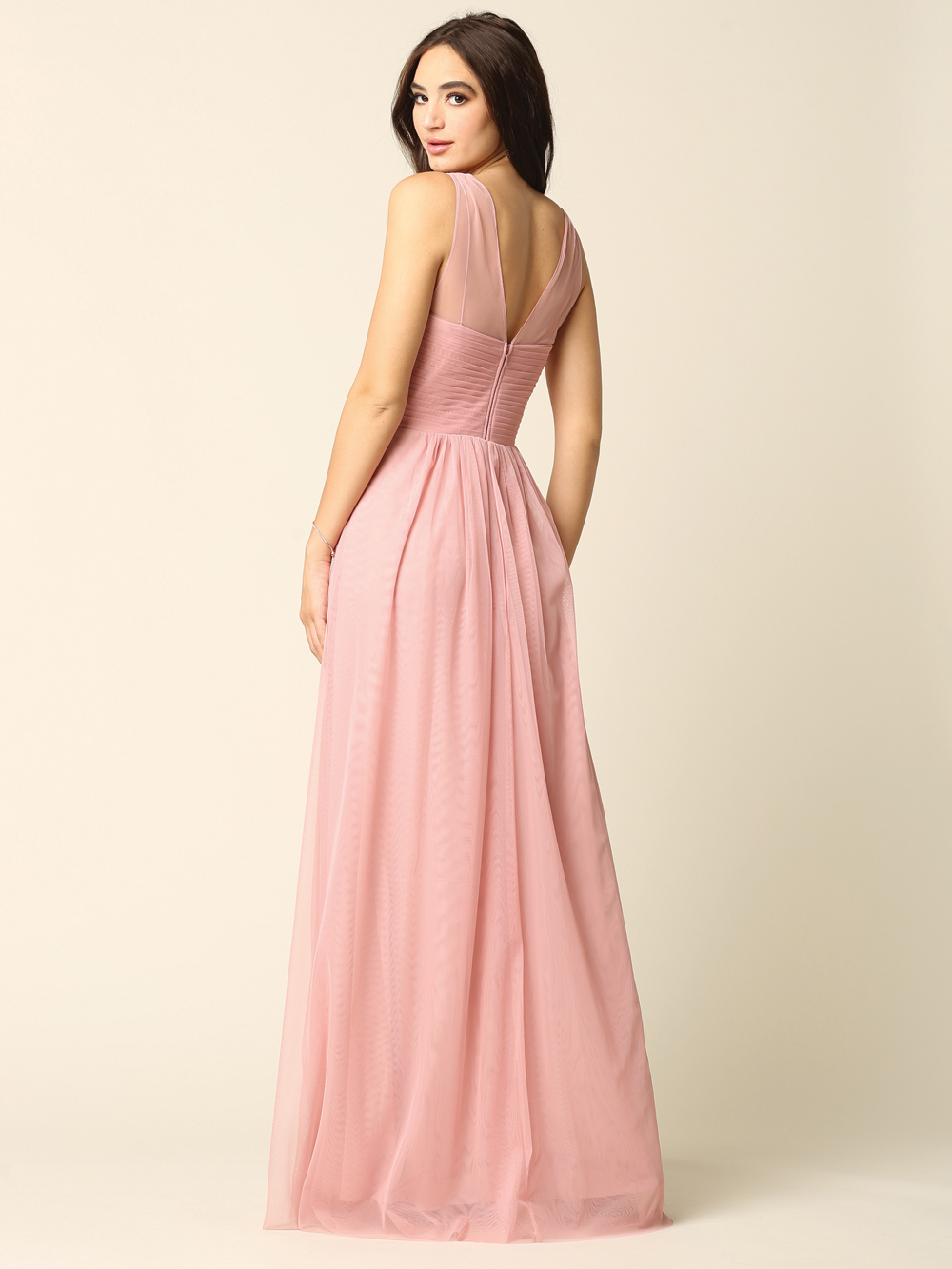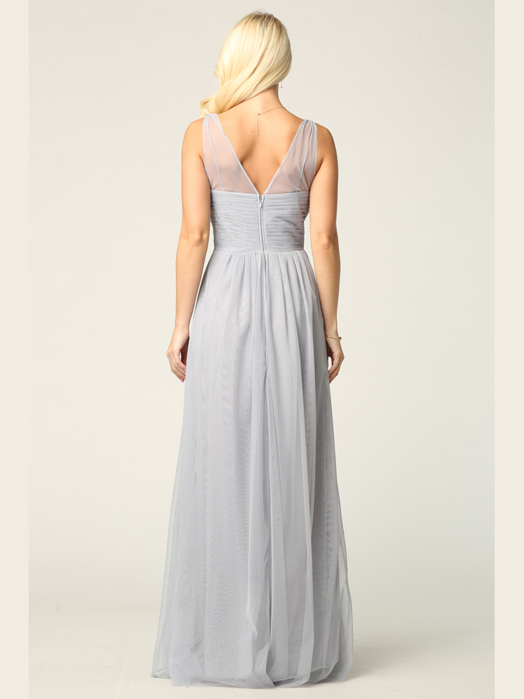 Shirred bodice overlay with front and back V-shape neckline. A-line floor length skirt completed the look.
