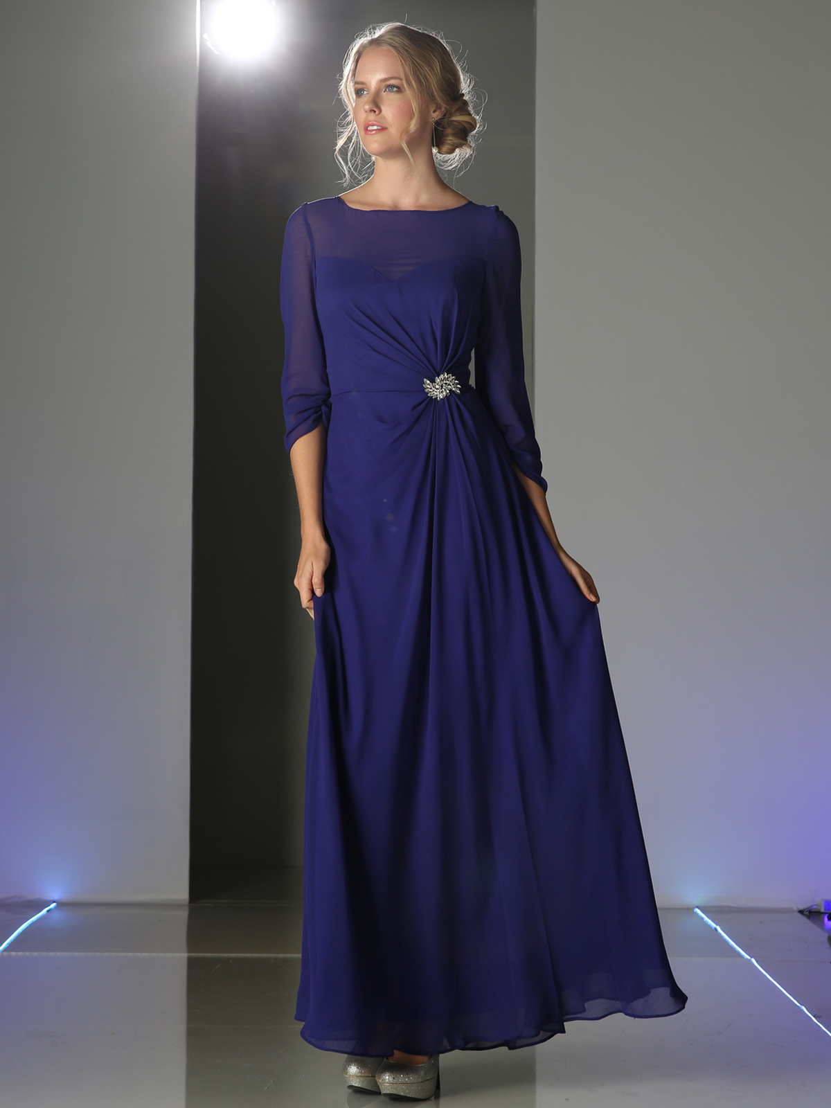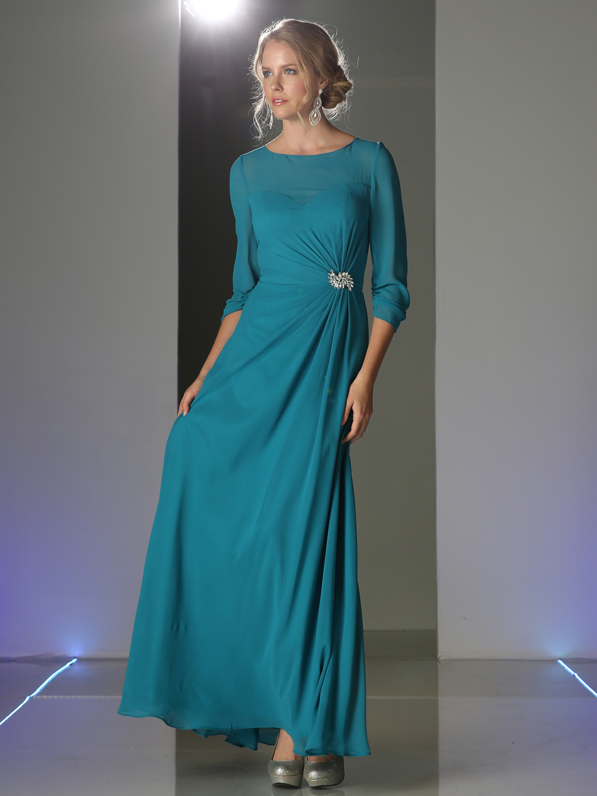 This mother of the bride gown is elegant and ready to be shown off. The scooped neckline is sheer and is overlaid on a sweetheart top. There is a light ruching at the waistline where a sparkling broche is attached at the side. The 3/4 length sleeves are sheer and the skirt flows to the floor. Any mother would look fabulous in this gown.