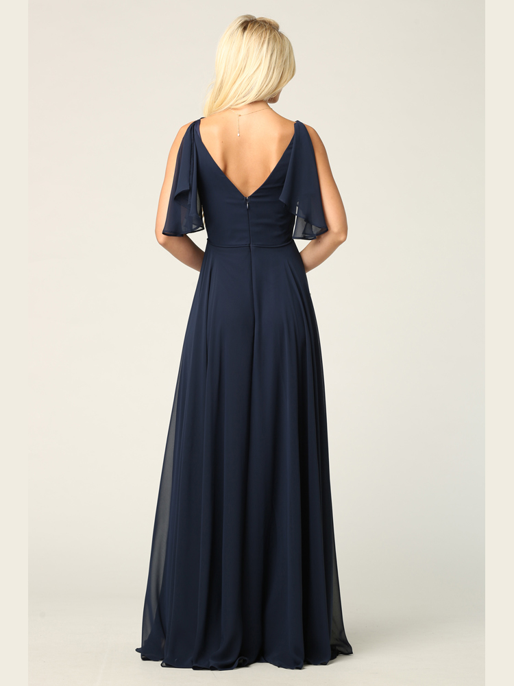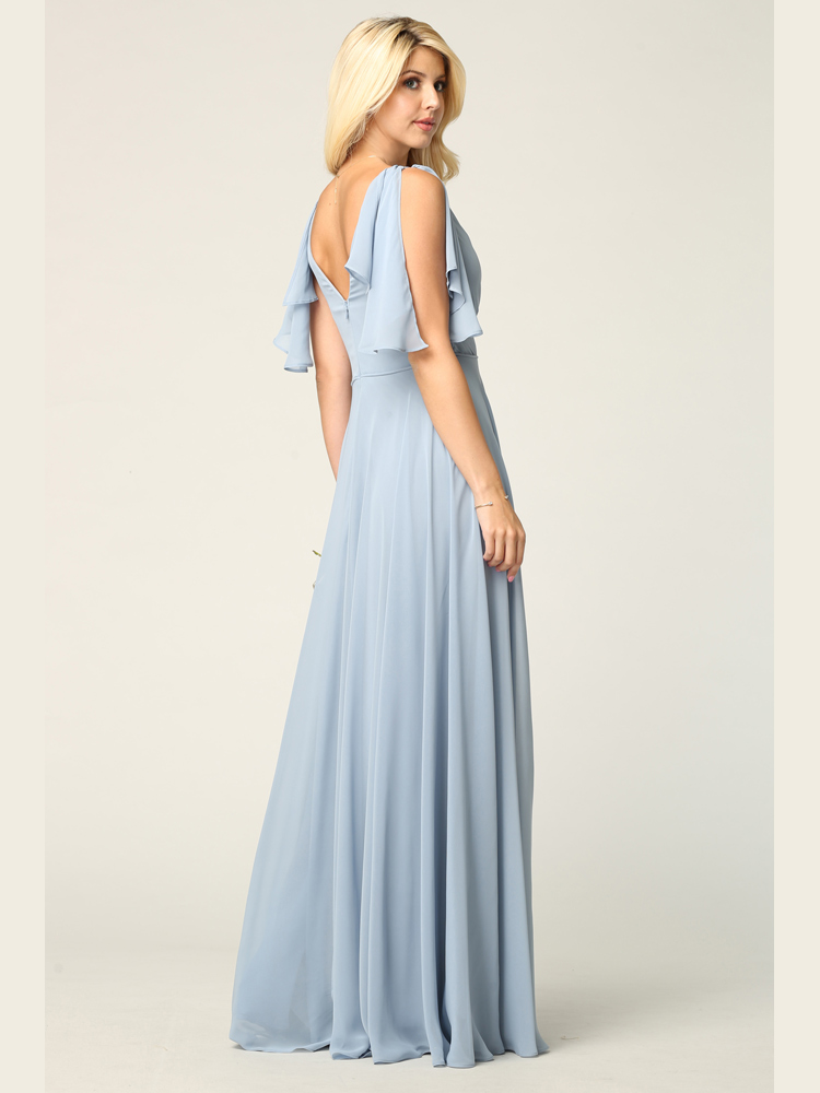 Romantic french style evening dress features blouson top with cold shoulder detail. Lightweight chiffon floor length skirt with side slit.