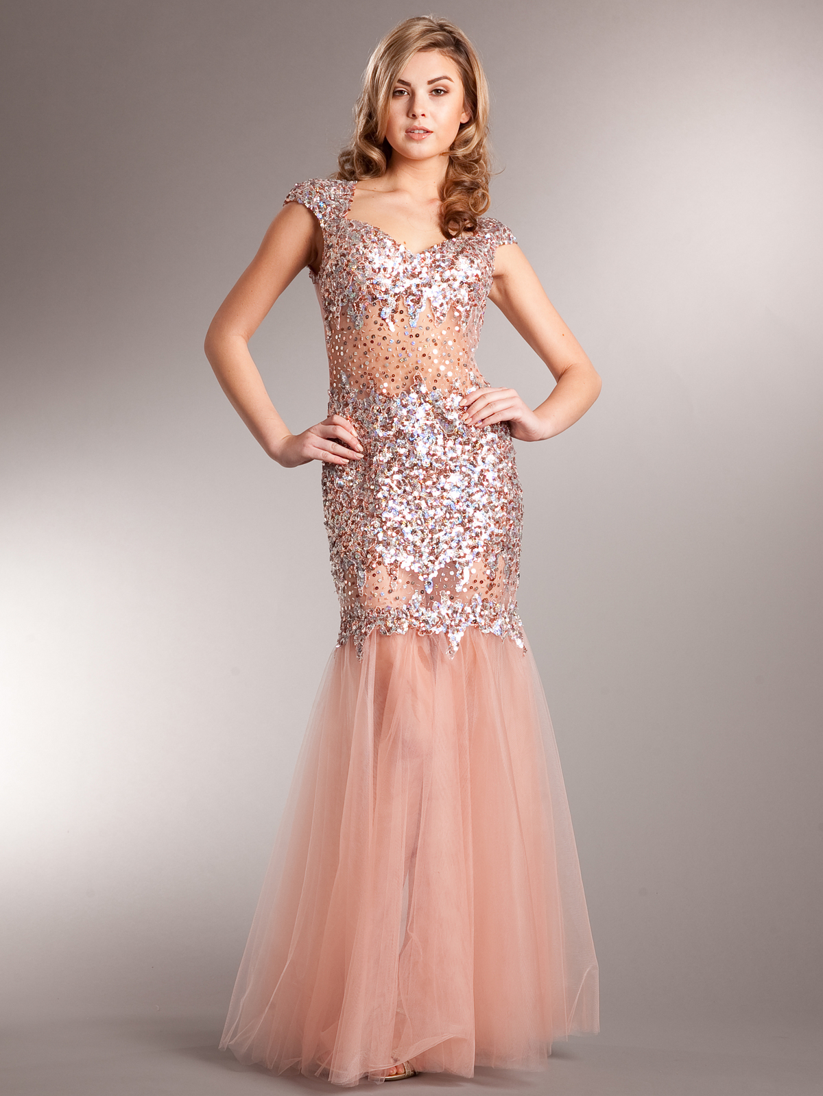 No one will ever forget how you looked that night when you were wearing this one of a kind, wow-factor gown! This trumpet silhouette dress fits and flares; giving your curves complete attention. Curvy cap sleeves and a sweetheart neckline also help draw the eye upward and provide subtle shaping to your upper half. The back of the gown has a sexy cut-out design and a sheer panel to provide support and structure. Perfectly positioned rhinestones and sparkly beads will make heads turn, and playful, peek-a-boo features and sheer tulle allow you to showcase your favorite figure features. -Zipper entry. -Approx. 60 inches from underarm to hem. -Fully lined. -Polyester. -Imported.