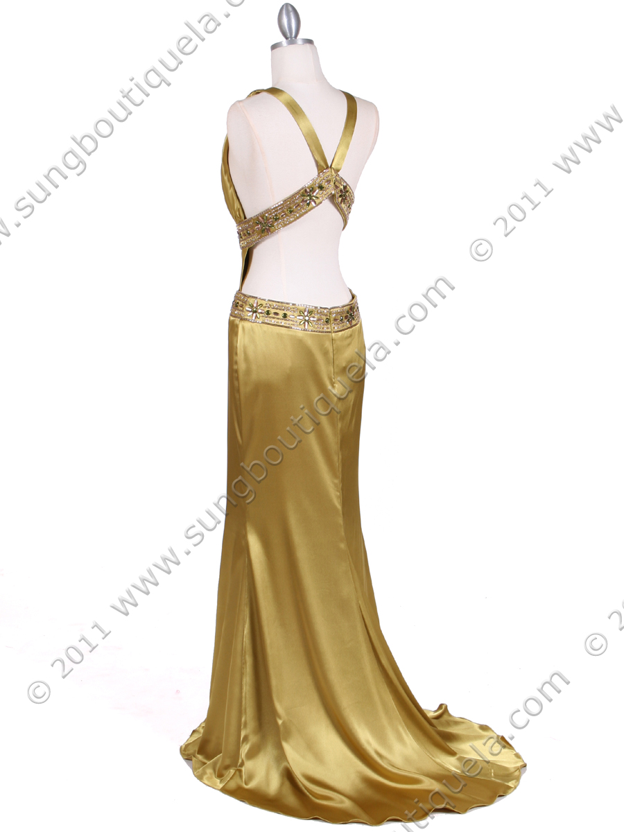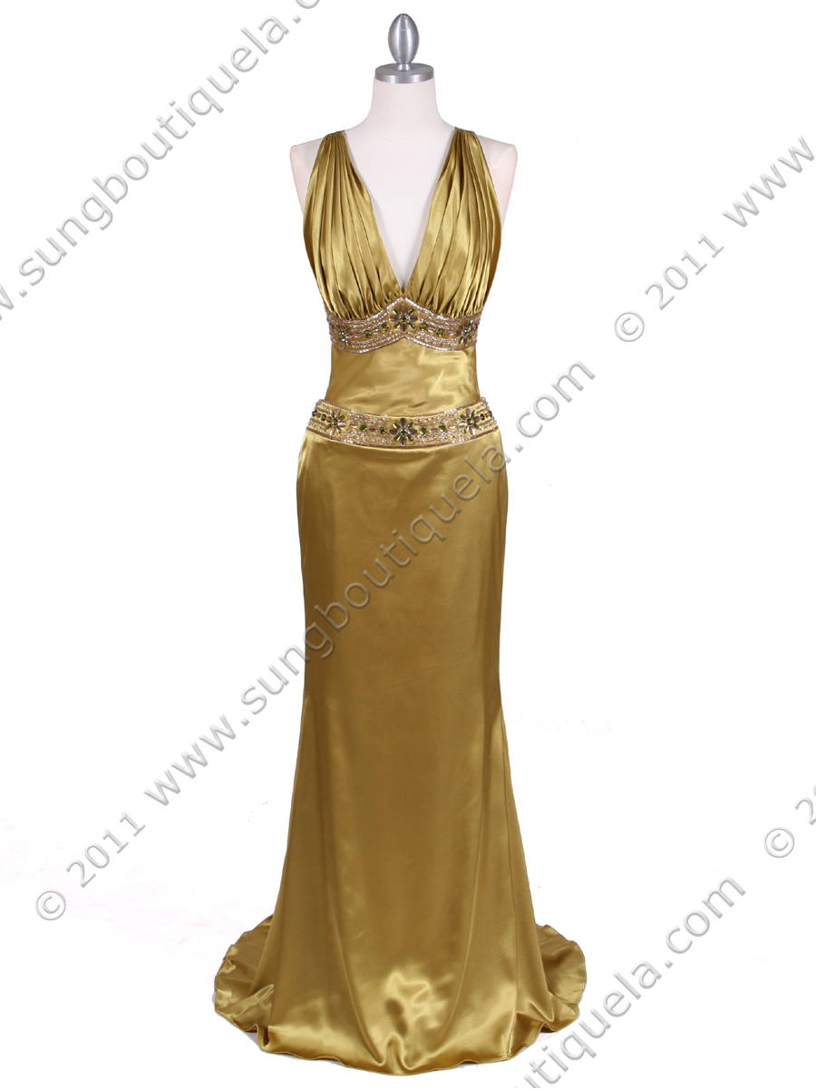 This glamorous shimmery charmeus gown features deep V-neck line with beading and faux jewels detail at the front, waist and the crisscross back. Elegant and Sexy. - Imported. - 100% polyester. - Fully lined. - Back zipper.