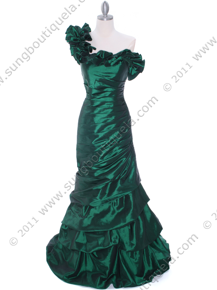 This beautiful one shoulder tafetta evening dress features shimmery fabric with ruffle details the neckline and the back. Pleated bodice with softly gathered tiers skirt finishes this fantastic look. - Matching shawl included. - Side zipper. - Built in cup. - Approx. 62 in. from shoulder to hem. - Fully lined. - 100% polyester. - Imported. Note: Select sizes are on back order until Mid-March.