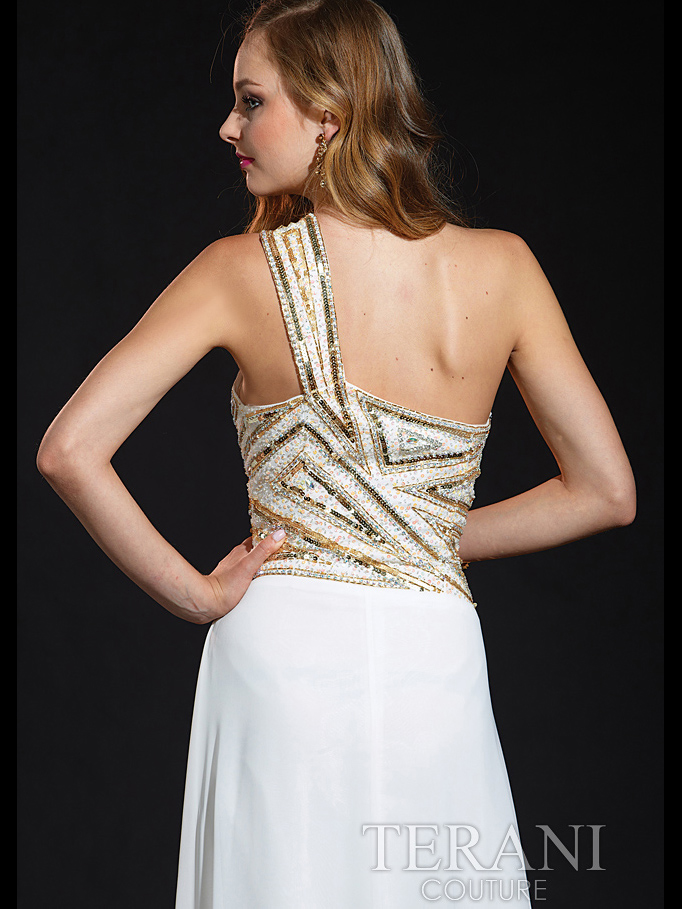 This elegant prom dress features a one shoulder and bodice detailed with sequins, jewels and beads in a triangle d�cor. The look is finished with a long floor length skirt and slit. -Zipper entry. -Approx. 63 inches from shoulder to hem. -Fully lined. -Polyester. -Imported.