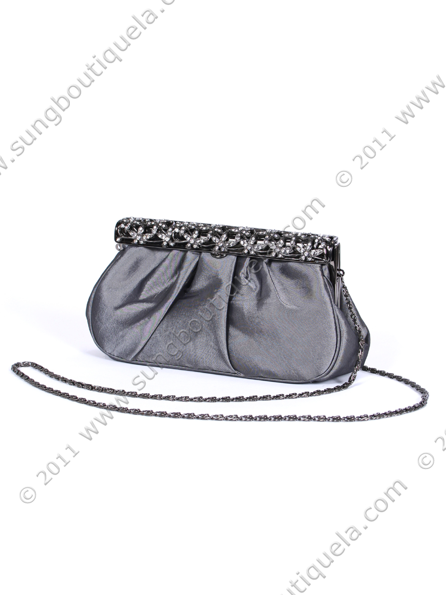 Bejeweled frame with clip closure tops a soft, pleated satin clutch with a drop-in chain strap. Available in Pewter, Taupe, and Wine. - Dimensions (inches): 8 W x 4.5 H x 2.5 D. - Shoulder chain strap drop: 22 inches - Interior credit card pocket. - Imported.