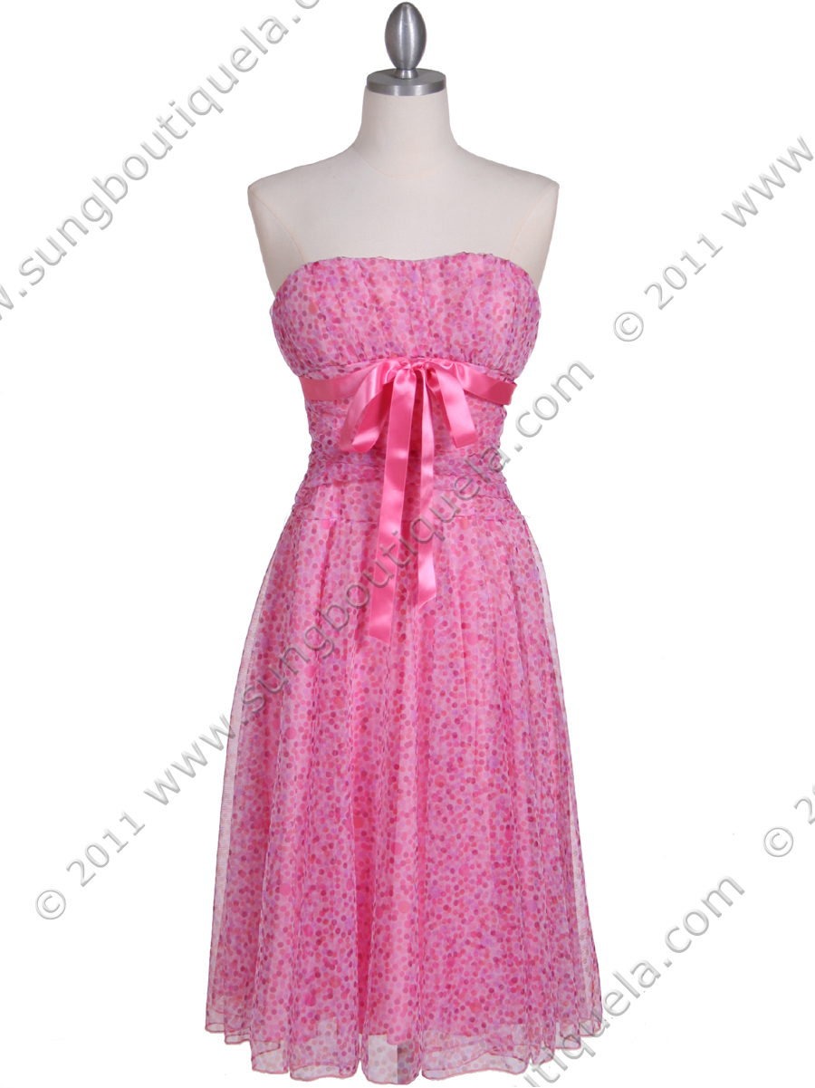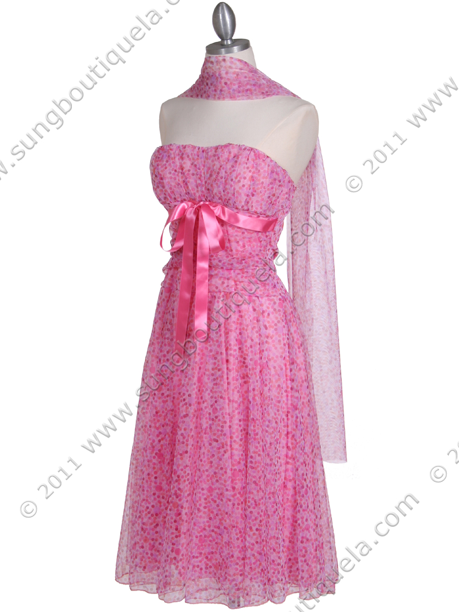 This beautiful strapless tea length dress features pleated bust with satin sash tie at the upper waist. Stretchy top band with shirred bodice give this knit mesh dress a secure fit. - Matching shawl included. - Slip on; No zipper. - Padded bust. - Approx. 38 in. from underarm to hem. - Fully lined. - 100% polyester. - Made in USA.