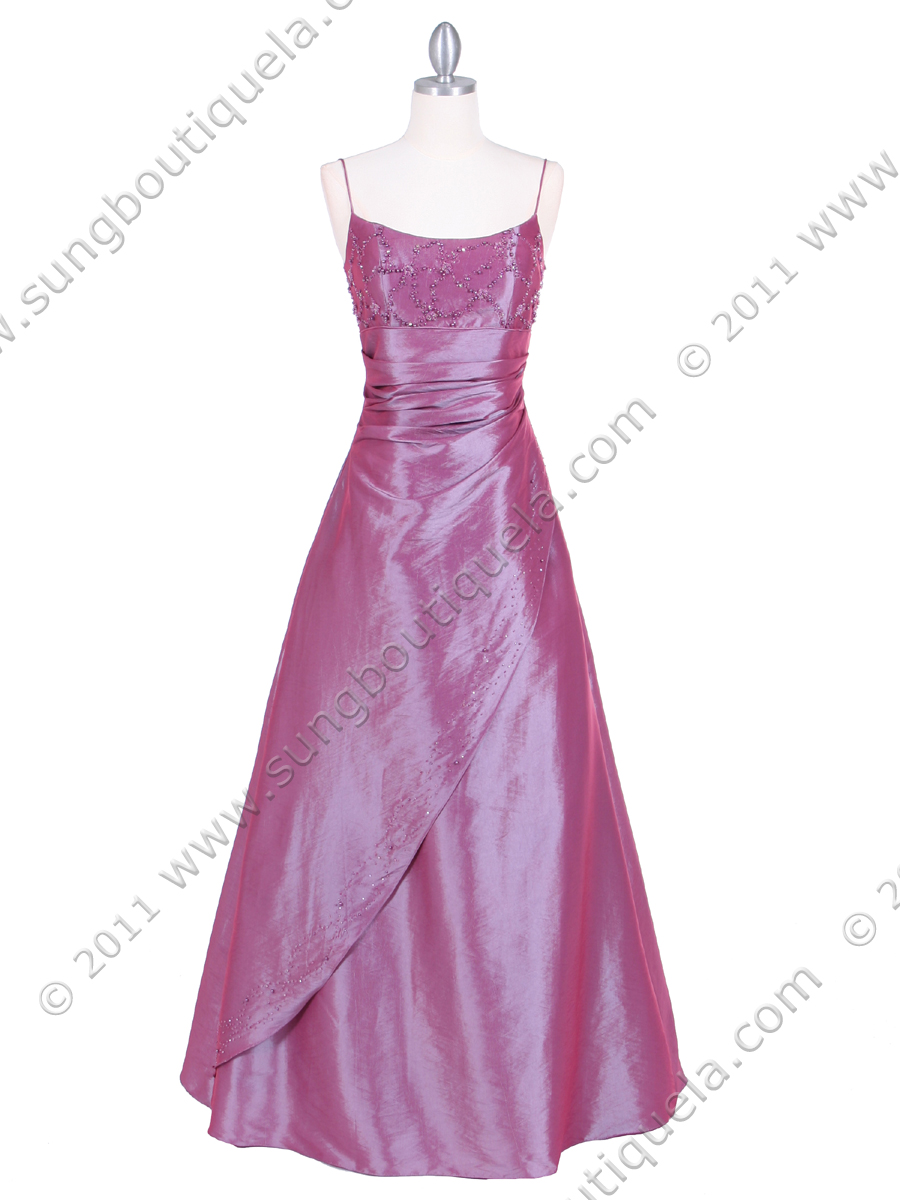 This beautiful plum color evening gown features shimmery light weight fabric and elegant beads adorn the front. Faux-wrap over layer design skims your shape and adds a sense of sophistication. Fully lined with an extra layer of netting to added fullness. Matching shawl is included. Imported. 100% polyester Back zipper entry.