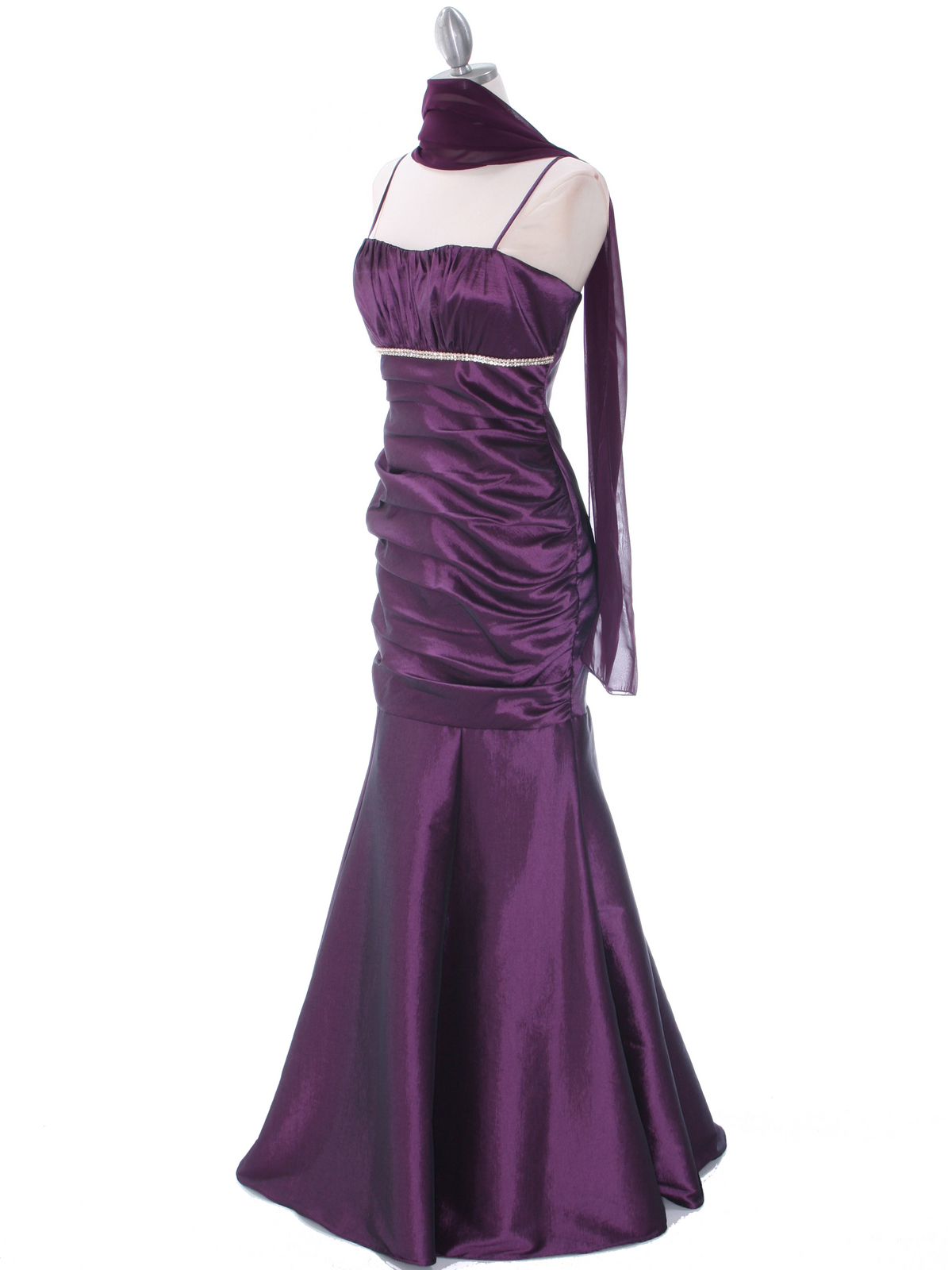 This beautiful taffeta evening dress features dazzling rhinestones adorn the top of the waist. Pleated fitted bodice and mermaid hem finishes the elegant look. - Matching shawl included. - Back zipper. - Approx. 58 in. from shoulder to hem. - Fully lined. - 100% polyester. - Made in USA.