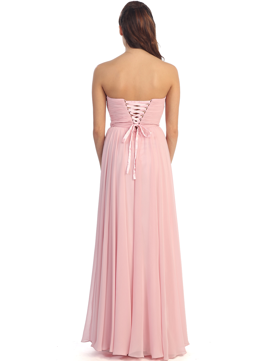 Sparkling sequin and beads detail the plunging neckline. Pleated bodice, criss-cross back with gently gathered full lightweight chiffon floor length skirt completes the feminine look. -Approx. 60 inches from underarm to hem. -Fully lined. -Polyester. -Imported