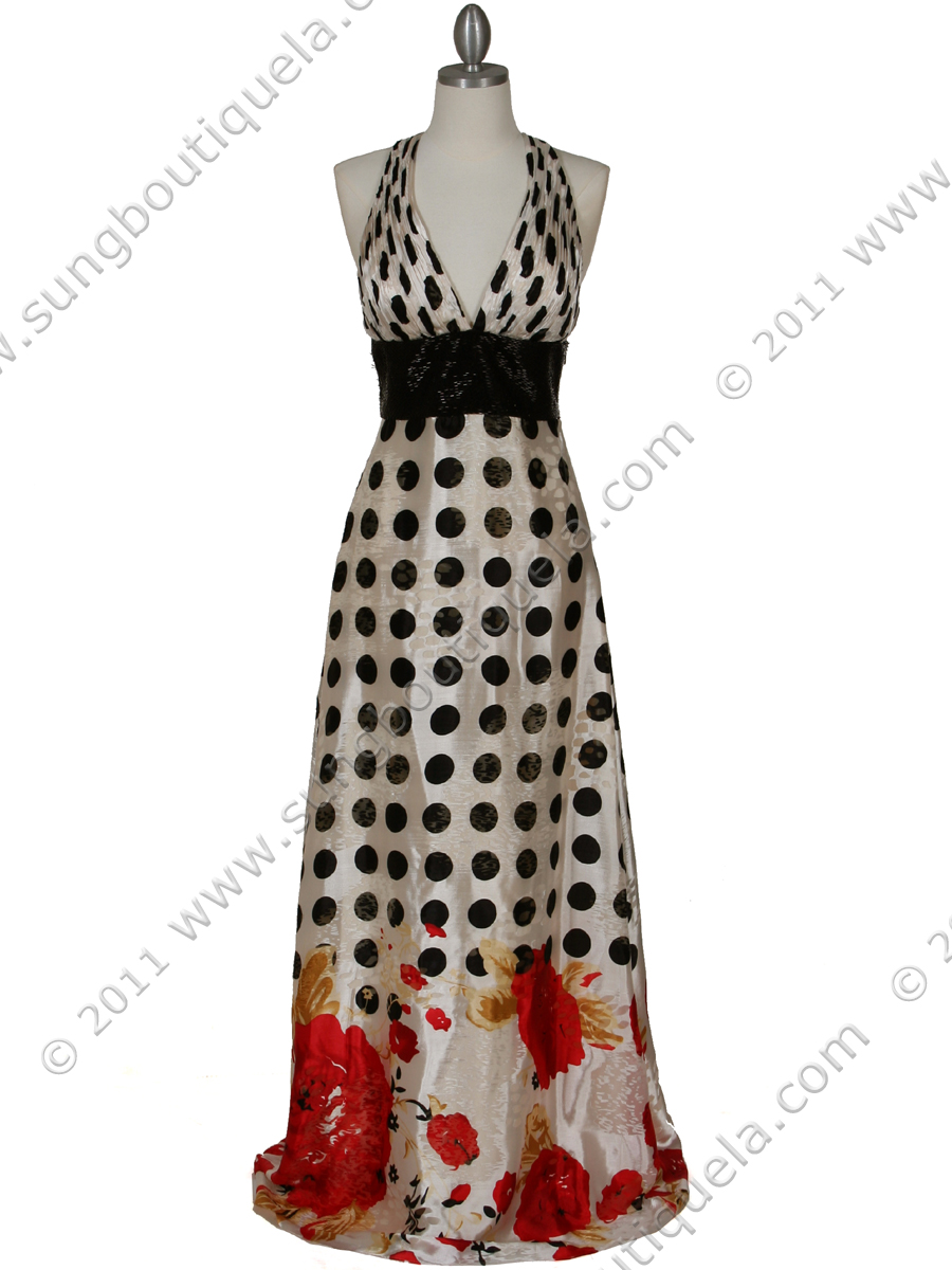 This fun and beautiful polka dot evening dress features halter neck with deep V-neckline. Sparkling beads adorn waist. Floral print adorn the hem. Beautiful and elegant. - Matching shawl included. - Padded bodice. - Side zipper entry. - Approx. 58 inches from shoulder to hem. - Fully lined. - 100% polyester. - Imported.