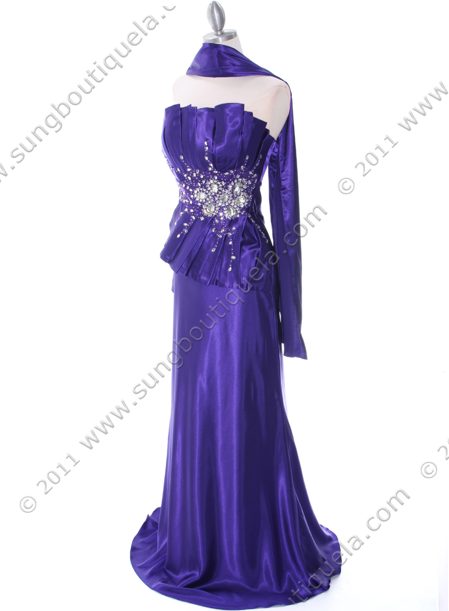 This elegant strapless evening dress features a unique contoured neckline with sparkling gems adorning the waist. Corset-like backing ensure the perfect fit. - Matching shawl included. - Side zipper. - Padded. - Approx. 54 in. from center front. - Fully lined. - 100% polyester. - Imported.