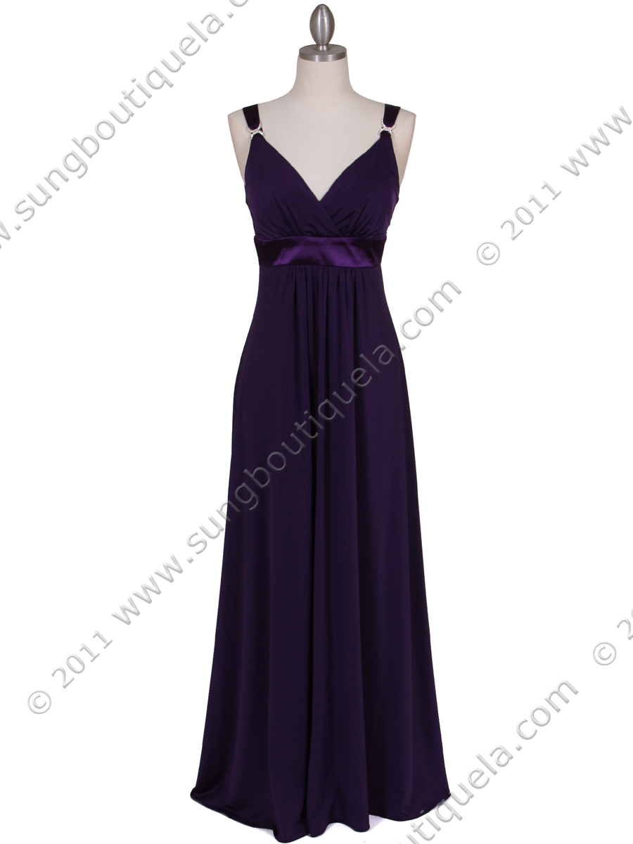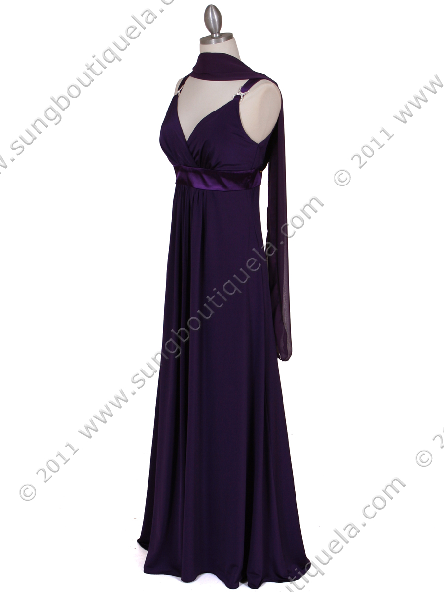 This elegant jersey evening dress features sparkling rhinestone pins adorns the straps with draped back detail the back. The Empire-waist with full fluid skirt finish the look. - Matching shawl included. - Padded bodice. - Back center zipper. - Approx. 58 inches from shoulder to hem. - Fully lined. - 100% polyester. - Imported.