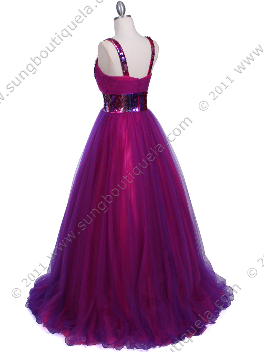 This dazzling floor-length silk gown features deep V-neckline with darker color at the hem. Brilliant purple and hot pink color lace overlay full ball skirt. - Matching shawl included. - Back zipper. - Approx. 60 in. from shoulder to hem. - Fully lined. - 100% polyester. - Imported.