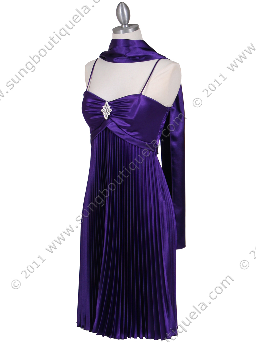 This beautiful satin cocktail dress features spaghetti straps with sweetheart neckline. Shirred bust with sparkling rhinestone pin adorns the front. Pleated satin dress finishes the elegant look. Side zipper entry. Matching shawl is included. Made in USA; 100% polyester.