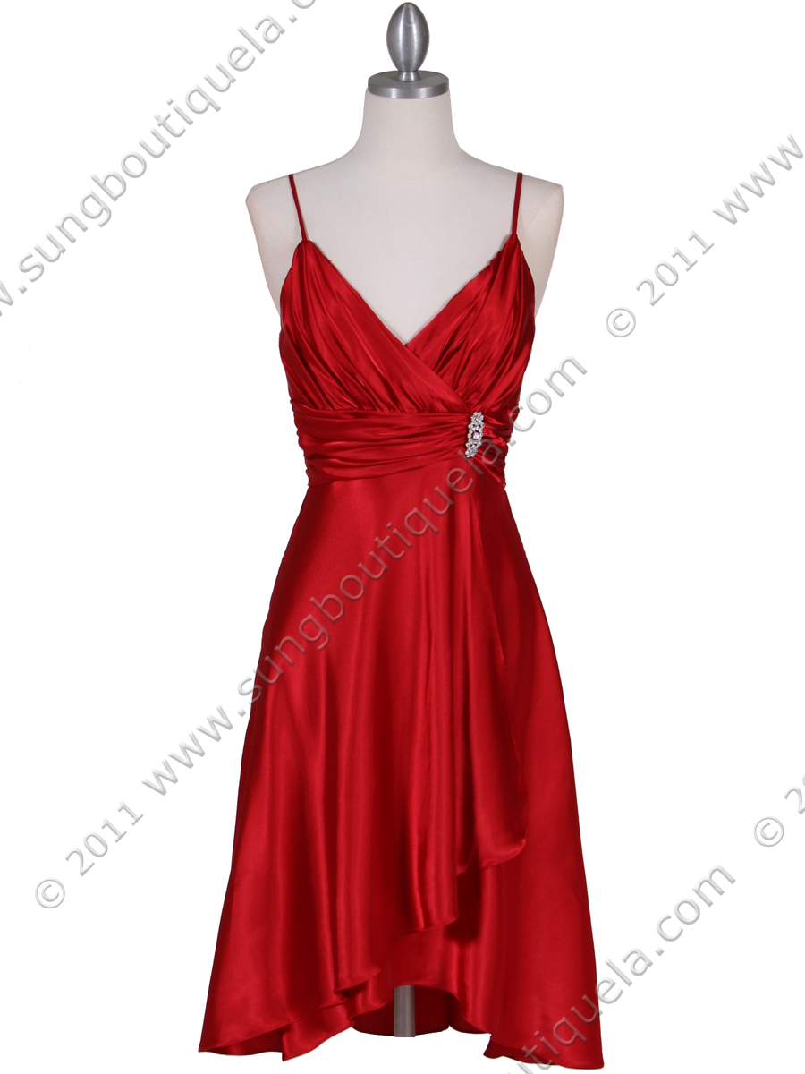• 083 Red Charmeuse Cocktail Dress with Rhinestone Pin - Red, Front View Medium