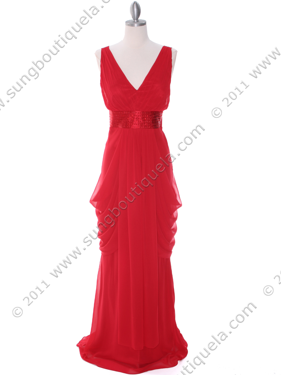 This beautiful light weight chiffon evening dress features V neckline with ruched bodice. Spakling jewels detail the empire waist. Draping skirt finished this elegant look. - Side zipper. - Padded bodice. - Approx. 63 in. from shoulder to hem. - Fully lined. - 100% polyester. - Made in USA.