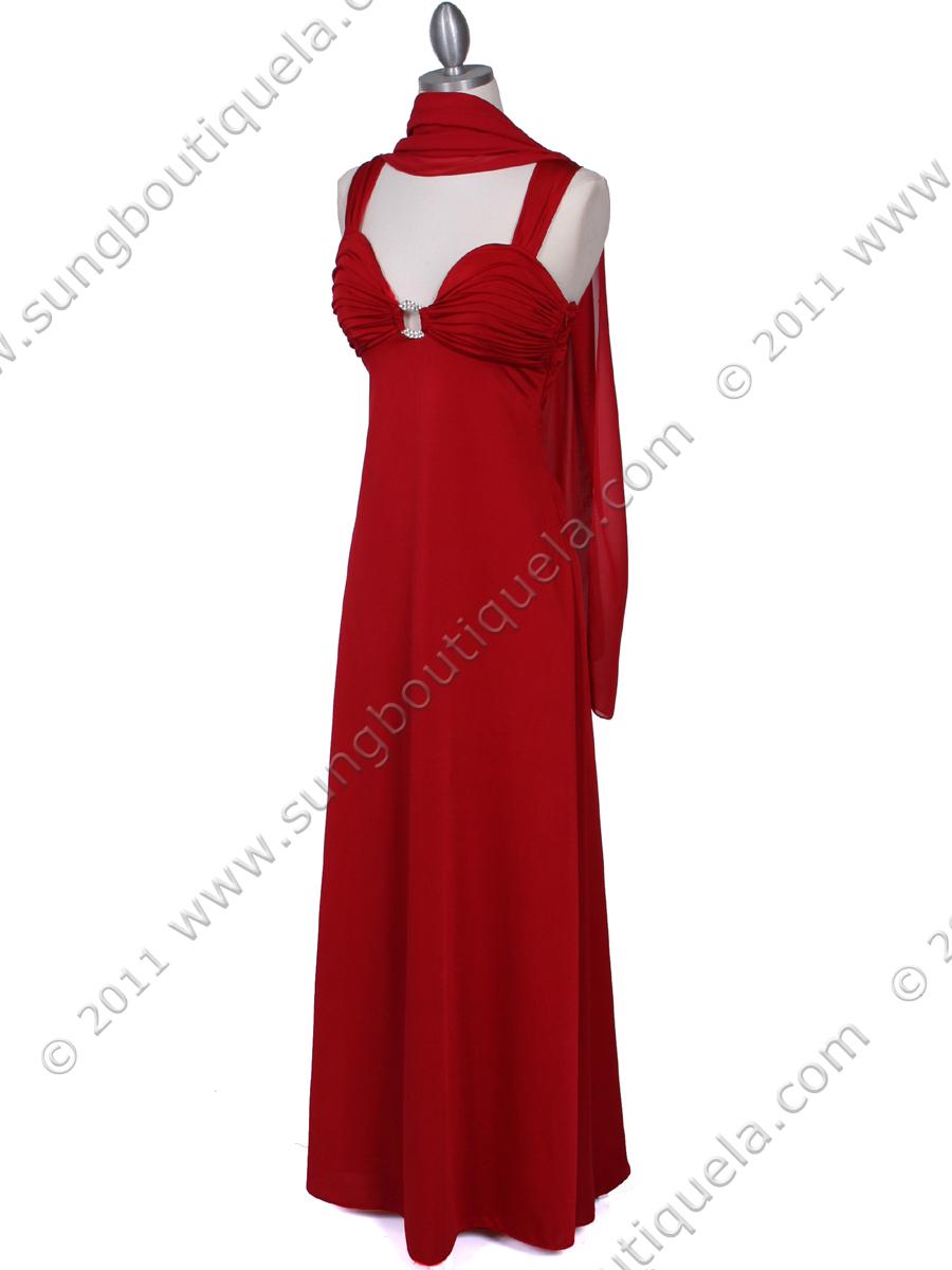 This elegant jersey evening dress features wide shoulder straps with sweetheart neckline. Sparkling jewel rings adorns the front, the criss cross back and the lower back. A graceful floor length skirt finished the look. . - Matching shawl included. - Padded. - Side zipper. - Approx. 58 in. from shoulder to hem. - Fully lined. - 100% polyester. - Made in USA.