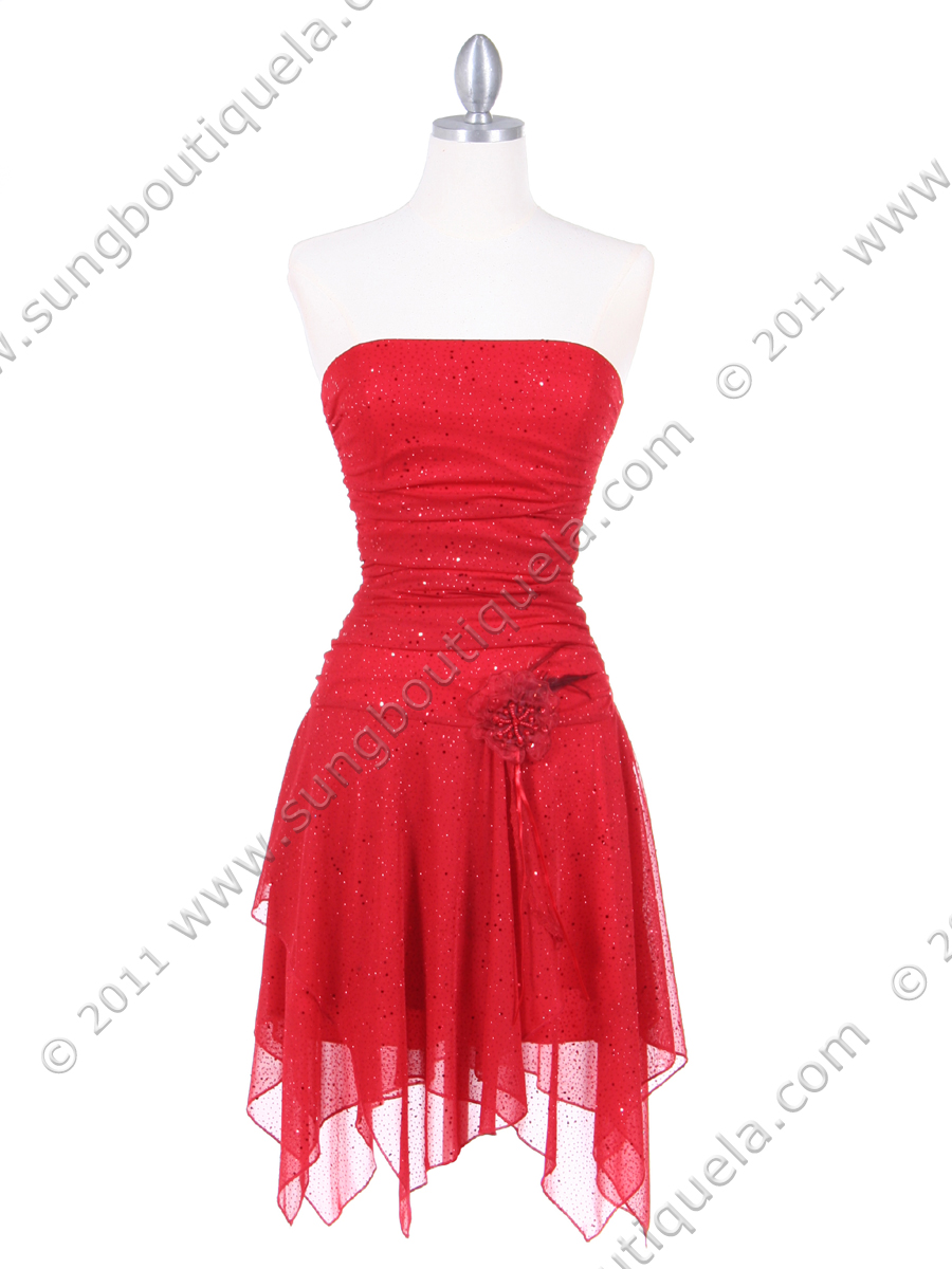This stylish strapless party dress features printed glittering pebbles. Shirring shapes the tube-style bodice, elasticized neckline, and romantic handkerchief hem. Sheer layers over solid lining. Slip-on; no closures. Knee length. Matching shawl included. Made in USA; 100% polyester.