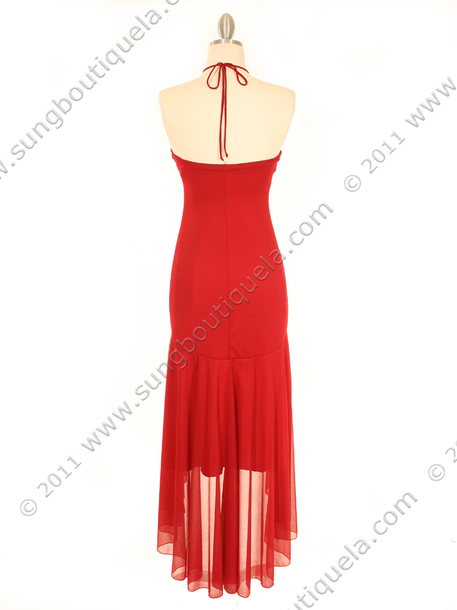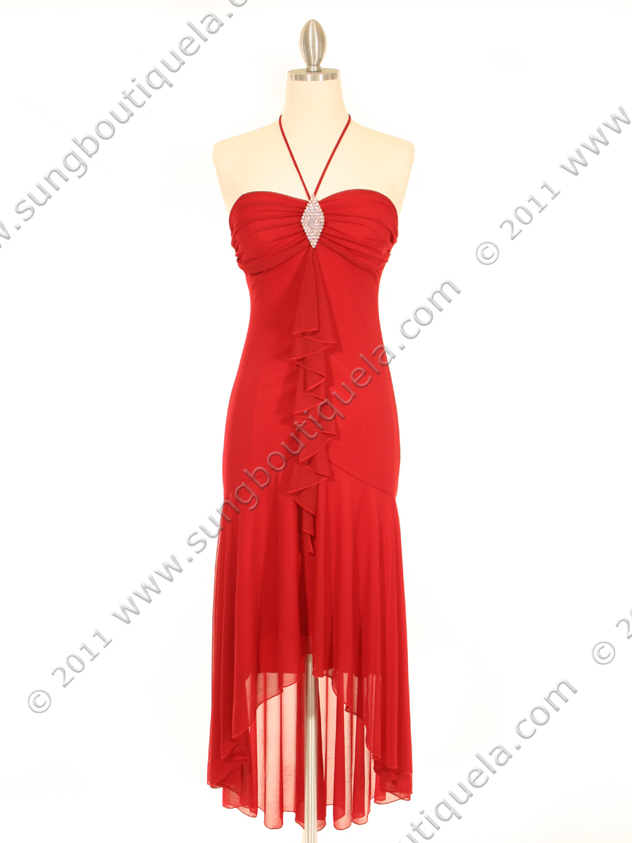 A beautiful combination of fitted and fluid, with a halter neckline, shirred bust, and gathered ruffled drape cascading from attached rhinestone brooch. Drop waist with asymmetrica ruffled hem. This is the dress for any special occasion. No zipper; slip on; matching shawl included. Made in USA; 100% polyester.