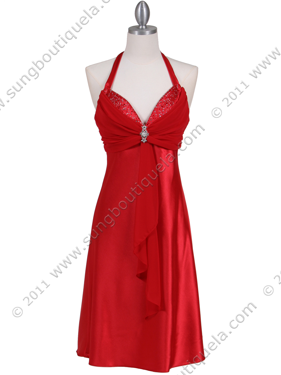 Lustrous halter satin cocktail dress features same toned beads detailed the sweetheart neckline. Lovely chiffon wraps the pleated bodice with dazzling rhinestone pin adorns the front. Open back with tie at the back. Matching shawl included.. Made in USA. 100% polyester. Back center zipper. Matching shawl included.