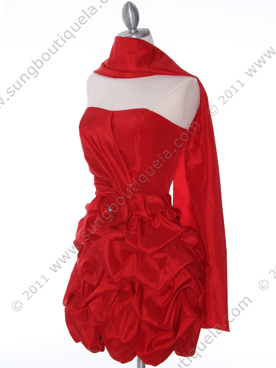 This sassy strapless homecoming dress features pleated bodice with rosette design adorns the waist. Bustled skirt finished the look. - Matching shawl included. - Back zipper. - Approx. 26 in. from underarm to hem. - 100% polyester. - Imported.