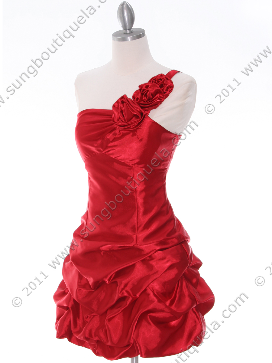 This beautiful charmeuse cocktail dress features rosettes adorning the shoulder. Simple neckline and bustled skirt finish the look. - Back zipper. - Padded bodice. - Approx. 34 in. from shoulder to hem. - Fully lined. - 97% polyester and 3% elastane. - Hand wash cold and cool iron. - Imported.