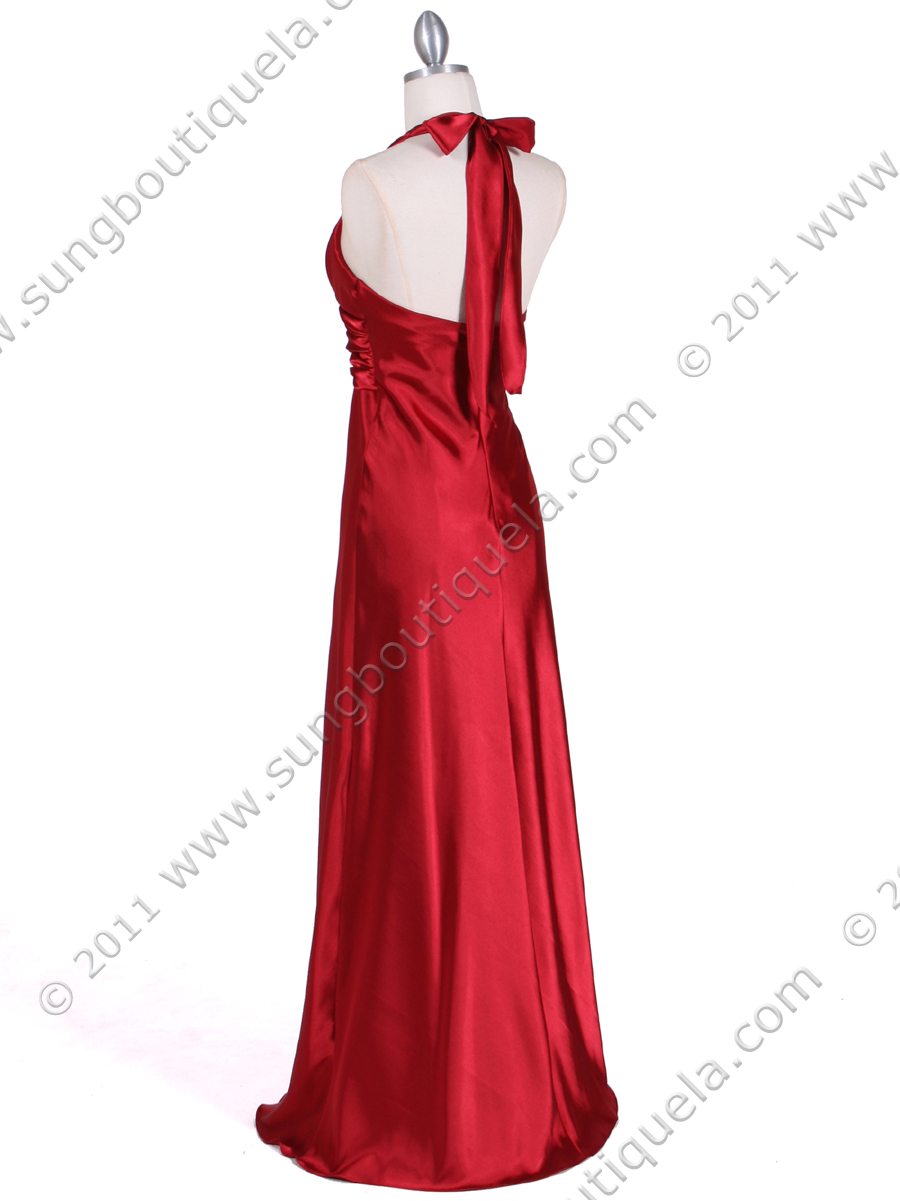 This elegant satin evening gown features halter neck with deep V-neckline. Slim and shirred waist with cascading sash and rhinestone brooch for added elegant. Back center zipper; matching shawl included. Made in USA; 100% polyester.