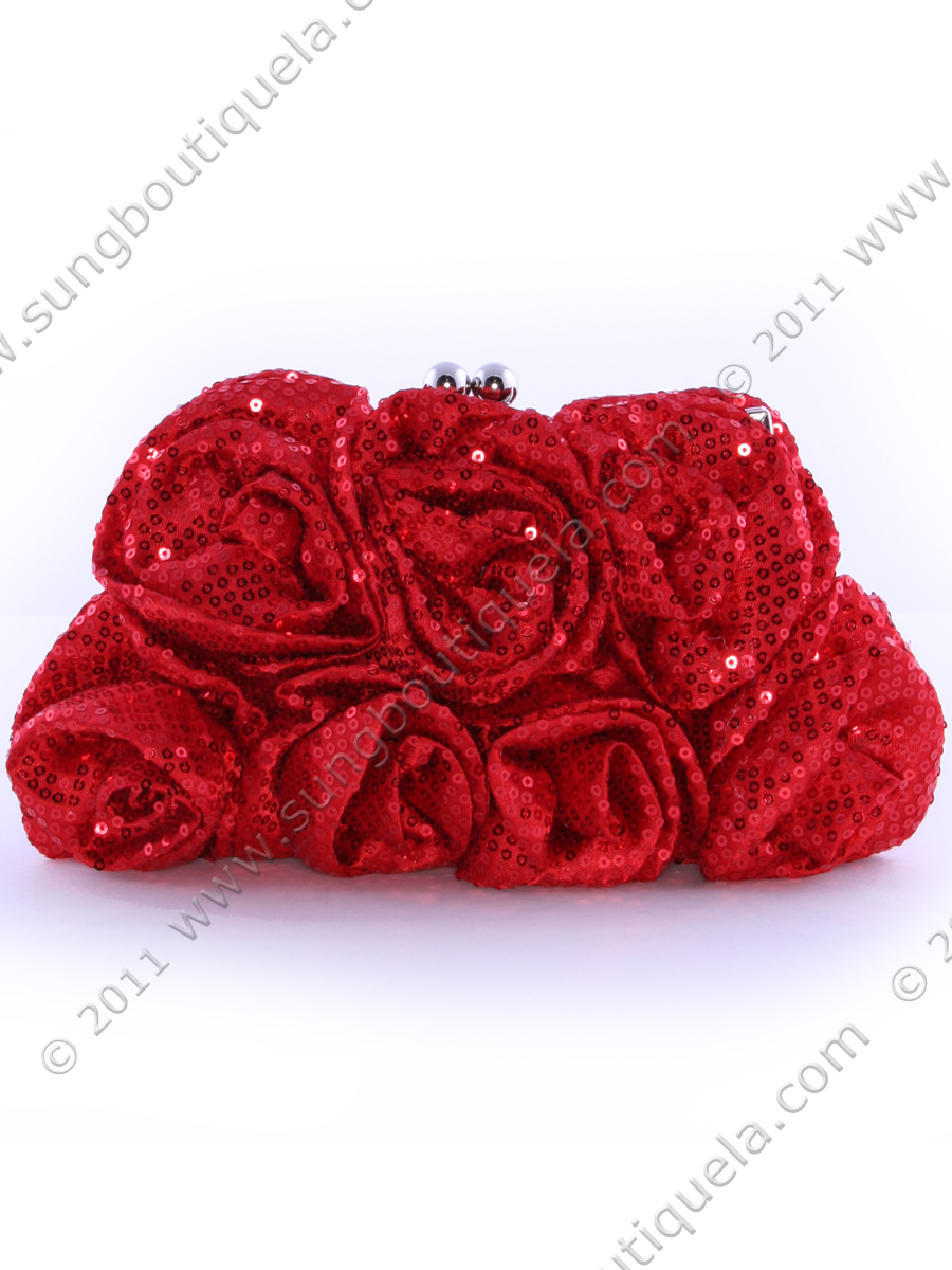 Beautiful sequins rosettes cover the front and the back of the shimmery evening bag. Kiss-lock closure. Available in Hot Pink, Black and Red color. - Dimensions (inches): 9 W x 5 H x 2.5 D. - Shoulder chain strap drop: 22 inches. - Hand held chain strap: 7inches. - Imported.