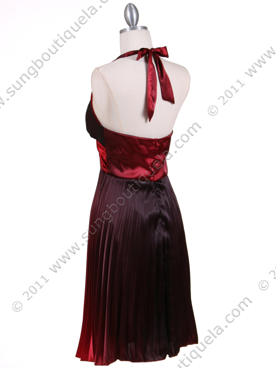 This beautiful two tone cocktail dress features halter neck with deep v neckline. Rhinestone buckle adorn the front. Full, fluid pleated skirt adds a sense of romance. Made in USA. 100% polyester. Back center zipper. Matching shawl included.