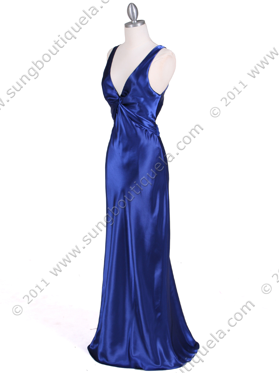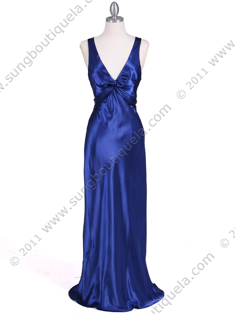 This beautiful light weight silky satin floor-length evening dress features curve-skimming bias cut, styled with a deep V-neckline, a shirred bust and empire waist. Low back with satin and chiffon crisscross back straps. Chiffon lining; slip-on; no zipper. Made in USA; 100% polyester.