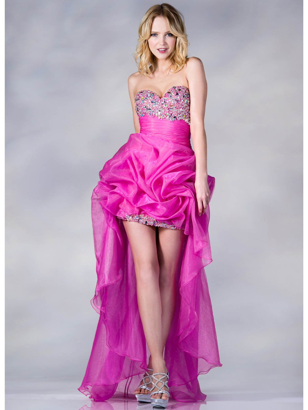 Shimmering fabric is bustled on this high low skirt. Jewel and bead embellishments adorn the sweetheart bodice and hemline. The look is completed with a pleated empire waistline. -Zipper entry. -Approx. 36 inches from underarm to front hem. -Approx. 63 inches form underarm to back hem. -Fully lined. -Polyester. -Imported.