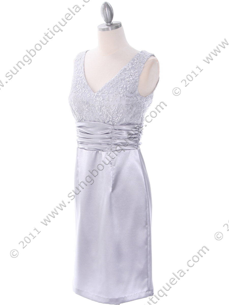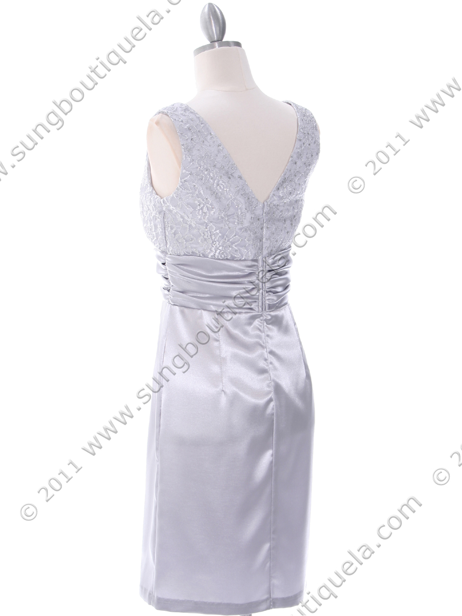 This sweet and sassy cocktail dress features a lace V-neckline overlaying a silver tone bodice. Satin fitted skirt is alluring to the eye. - Back zipper. - Built in cup. - Approx. 38 in. from Shoulder to hem. - Polyester. - Made in USA.