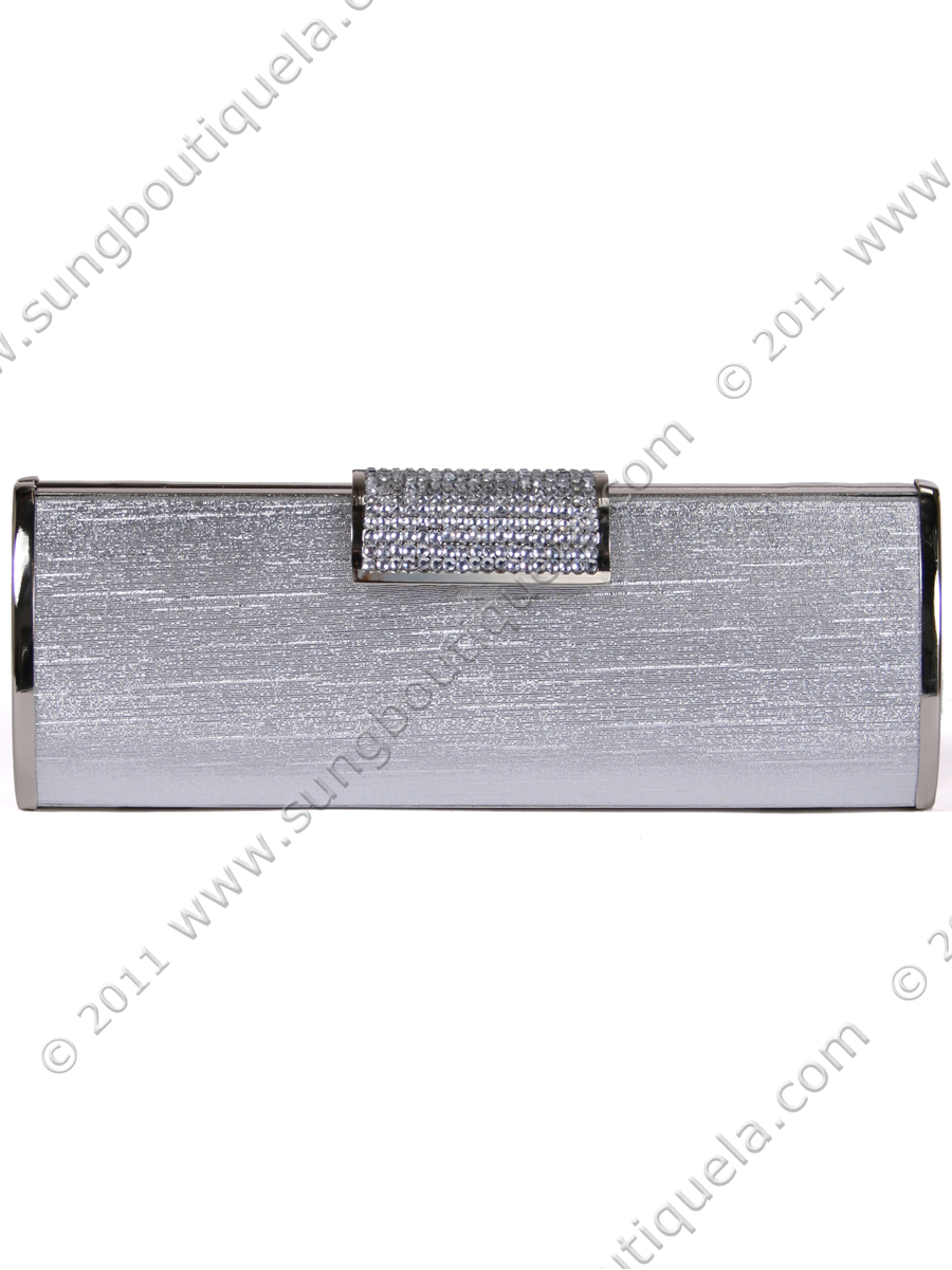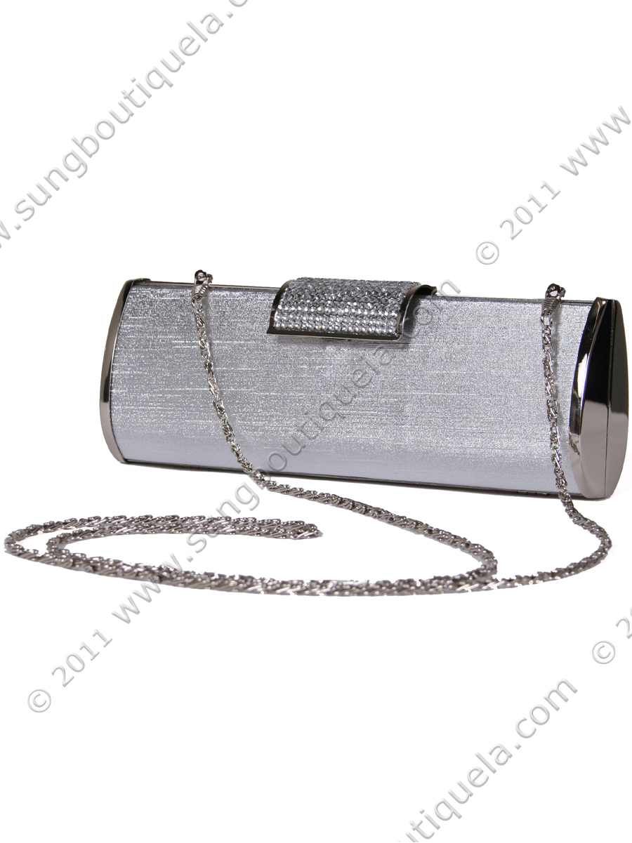 A chic hard bodied clutch is styled with sparkling rhinestone clip and drop-in chain straps. Available in black, gold and silver. - Dimensions (inches): 8.5 W x 3 H x 2 D. - Shoulder chain strap drop: 22 inches - Hand held chain drop: 8 inches - Imported.