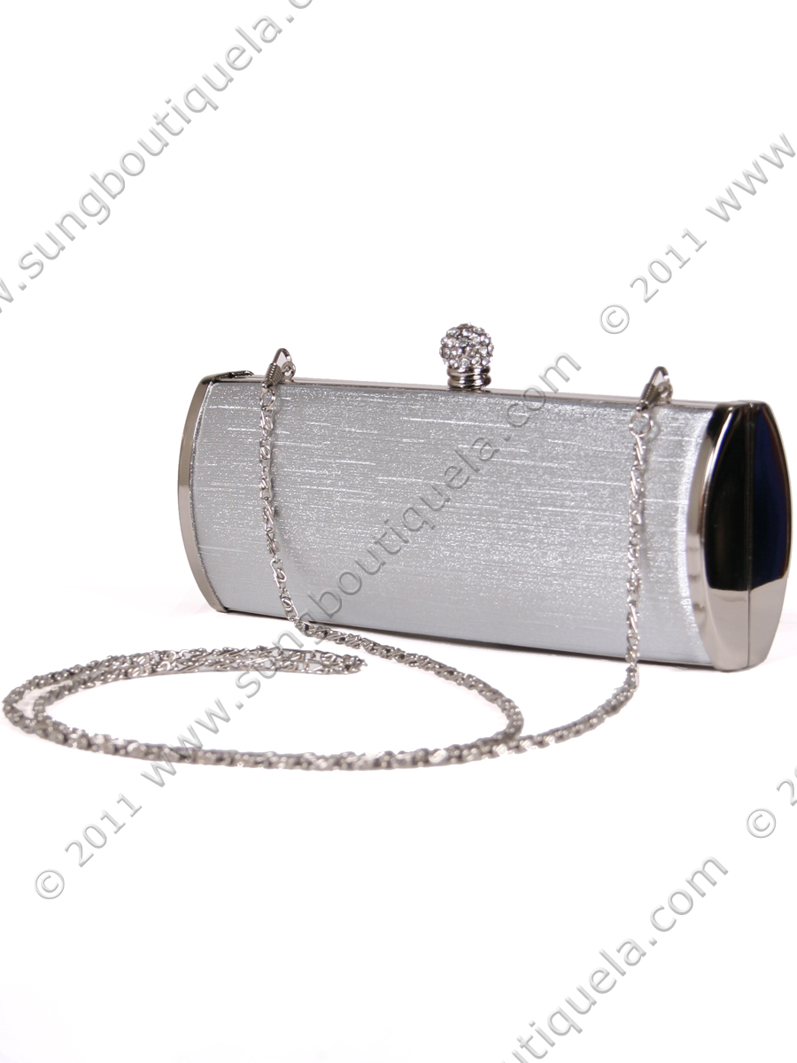 An elegant hard bodied clutch is styled with sparkling rhinestone clasp. Available in black and silver. - Dimensions (inches): 8.5 W x 3.25 H x 2 D. - Shoulder chain strap drop: 22 inches. - Hand held chain drop: 8 inches. - Imported.