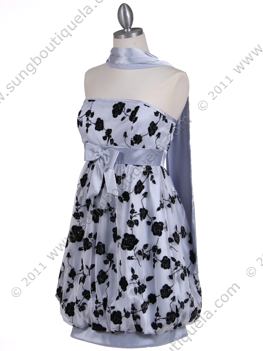 This beautiful cocktail dress features shirred bodice and a tied charmeuse empire waist. Floral design laced sparkles over a silver tone charmeuse lining. - Matching shawl included. - Back center zipper. - Boned bodice. - Approx. 29 in. from underarm to hem. - Fully lined. - 100% polyester. - Imported.