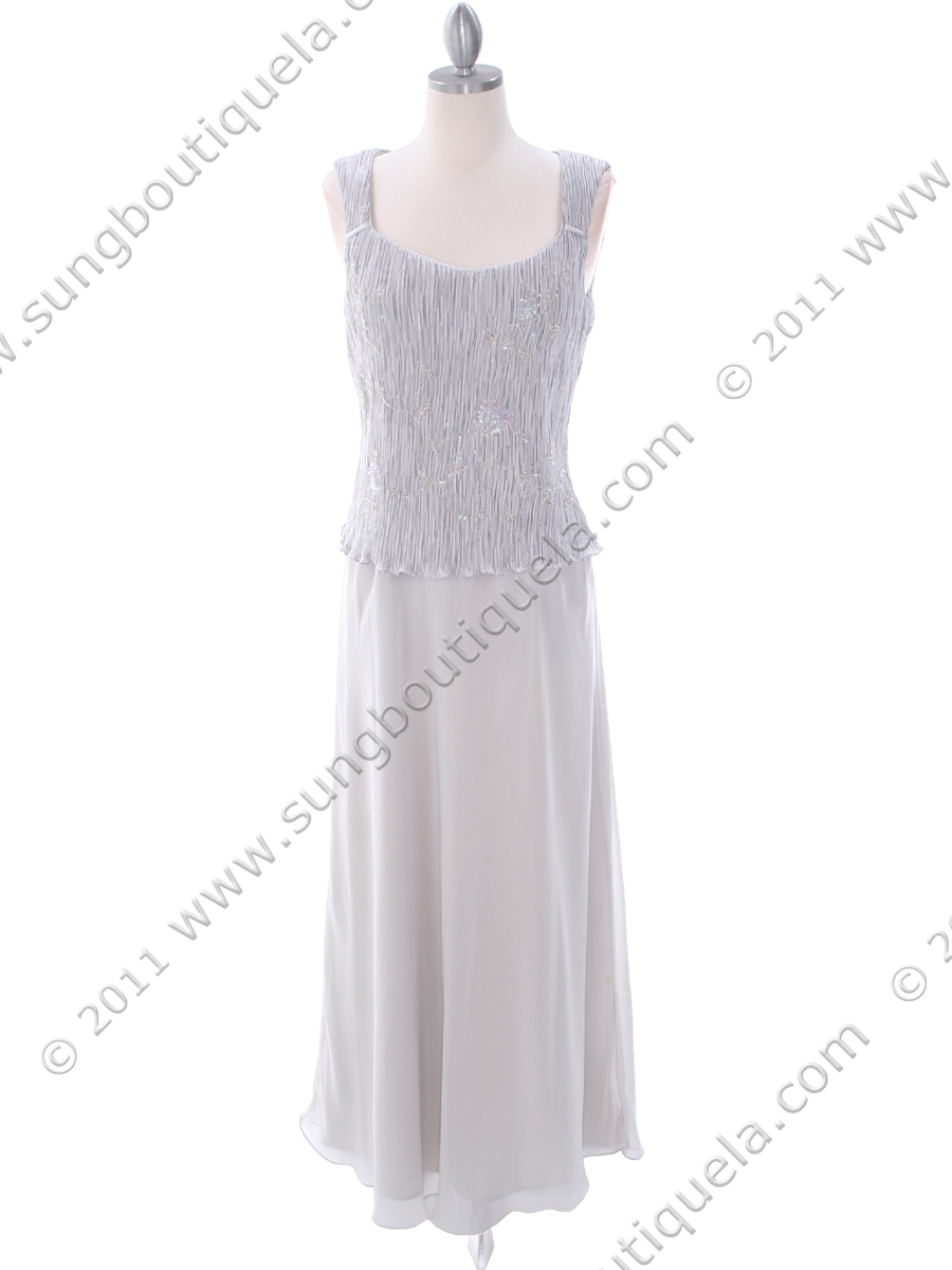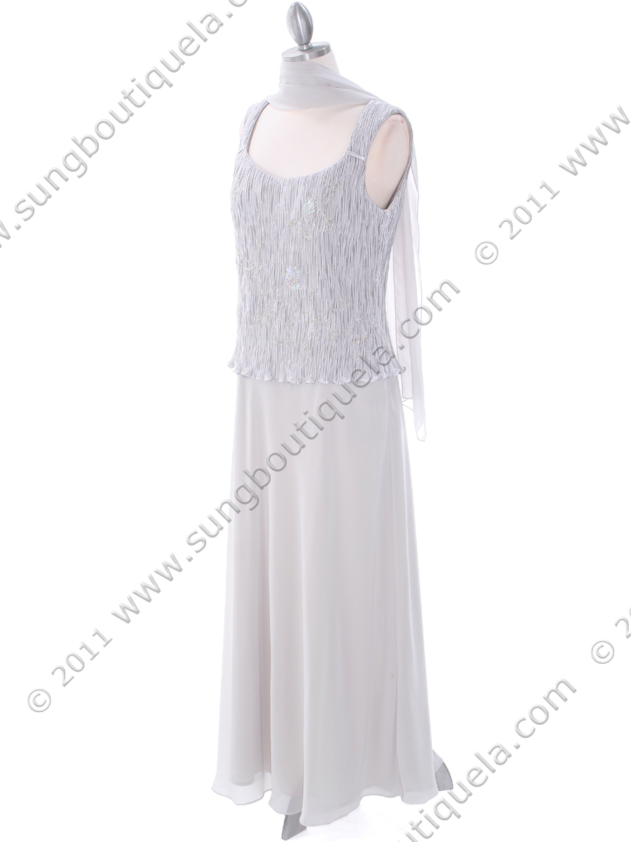This beautiful and classic evening dress features stylish beaded floral like embroidery. It also features flattering pleats through out the entire top portion of the dress. - Matching shawl included. - Back zipper. - Approx. 55 in. from shoulder to hem. - Fully lined. - 100% polyester. - Imported.