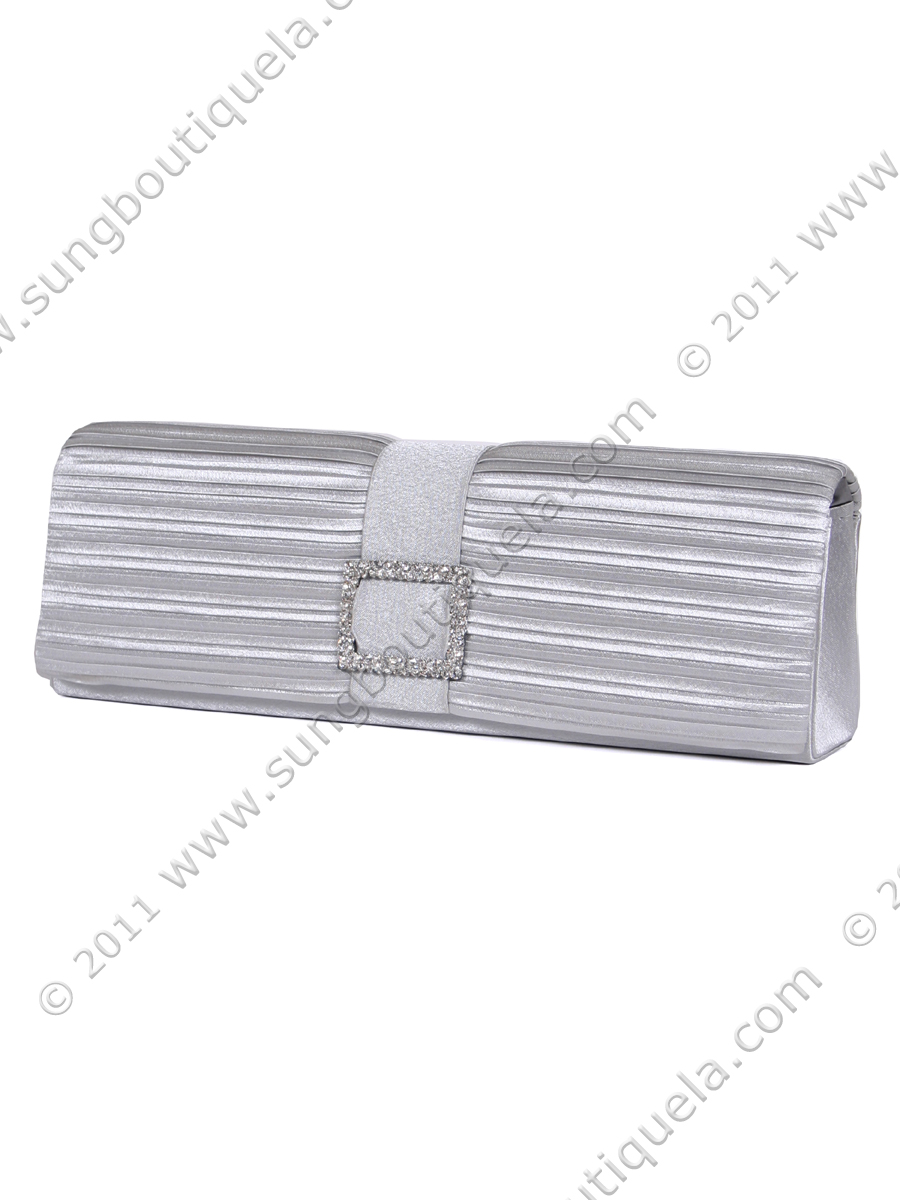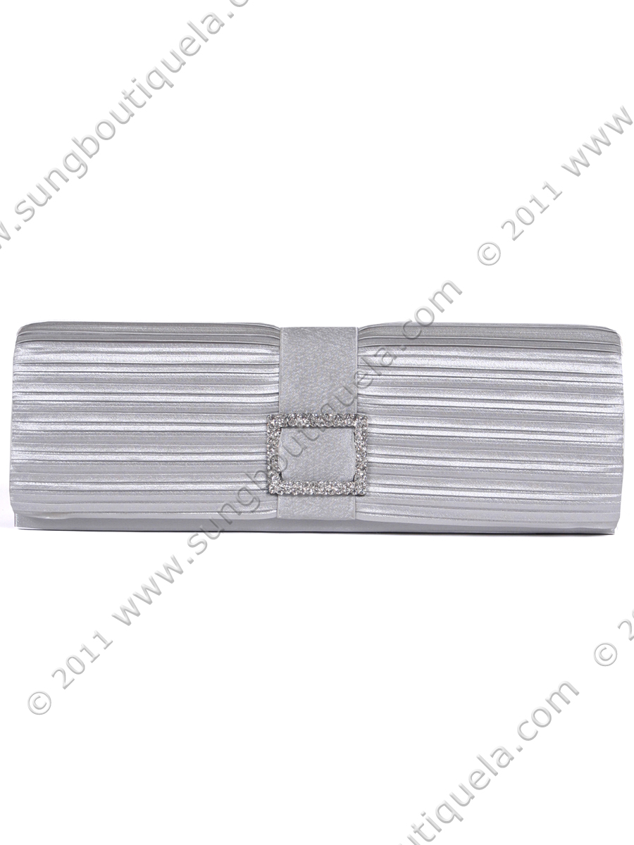Beautiful pleated satin evening bag adorned with sparkling rhinestone buckle. Available in Black, Dark Grey, Red, and Silver. - Dimensions (inches): 11 W x 4 H x 2 D. - Braided shoulder strap: 22 inches. - Front flap with magnetic closure. - Imported.
