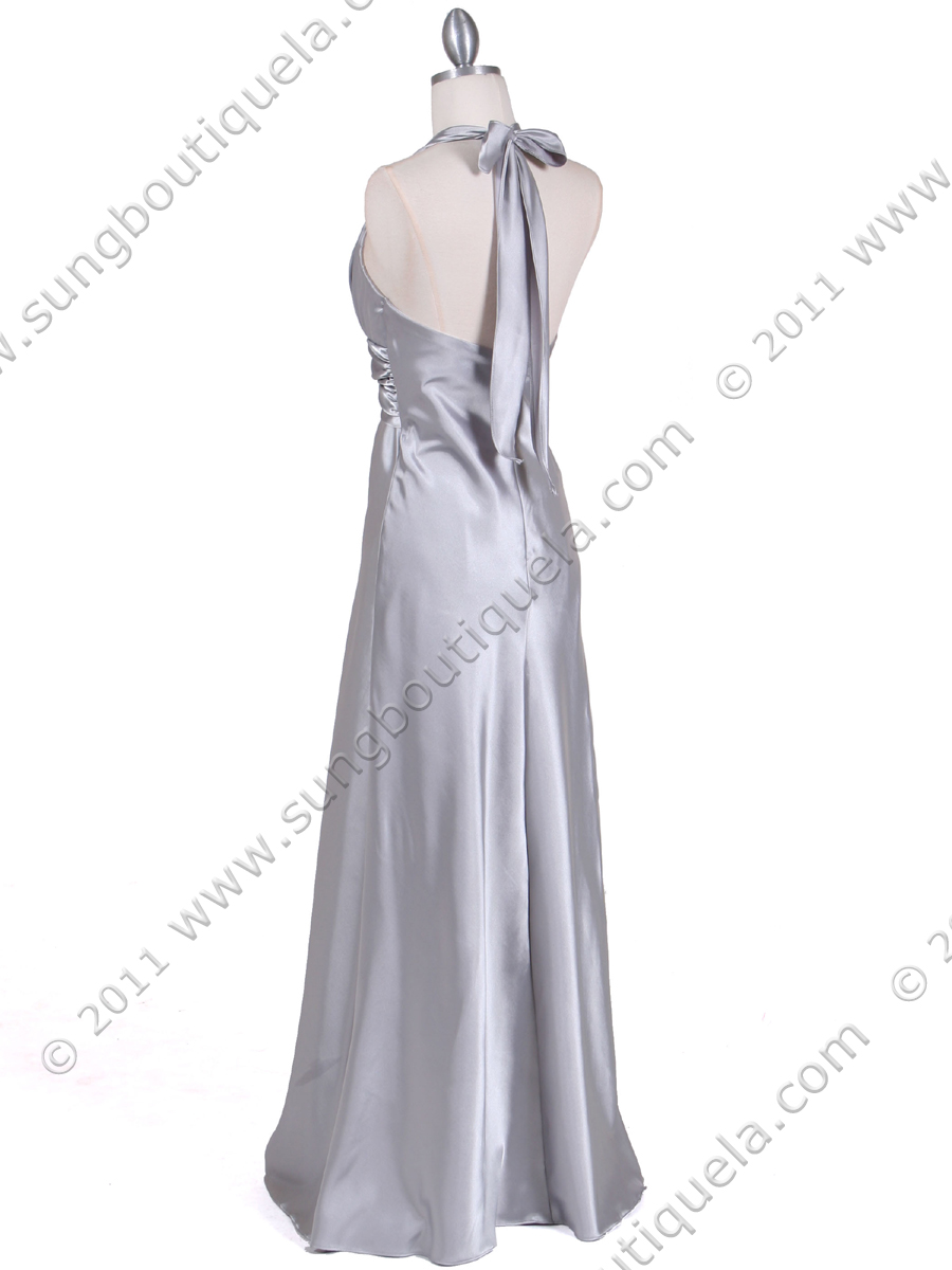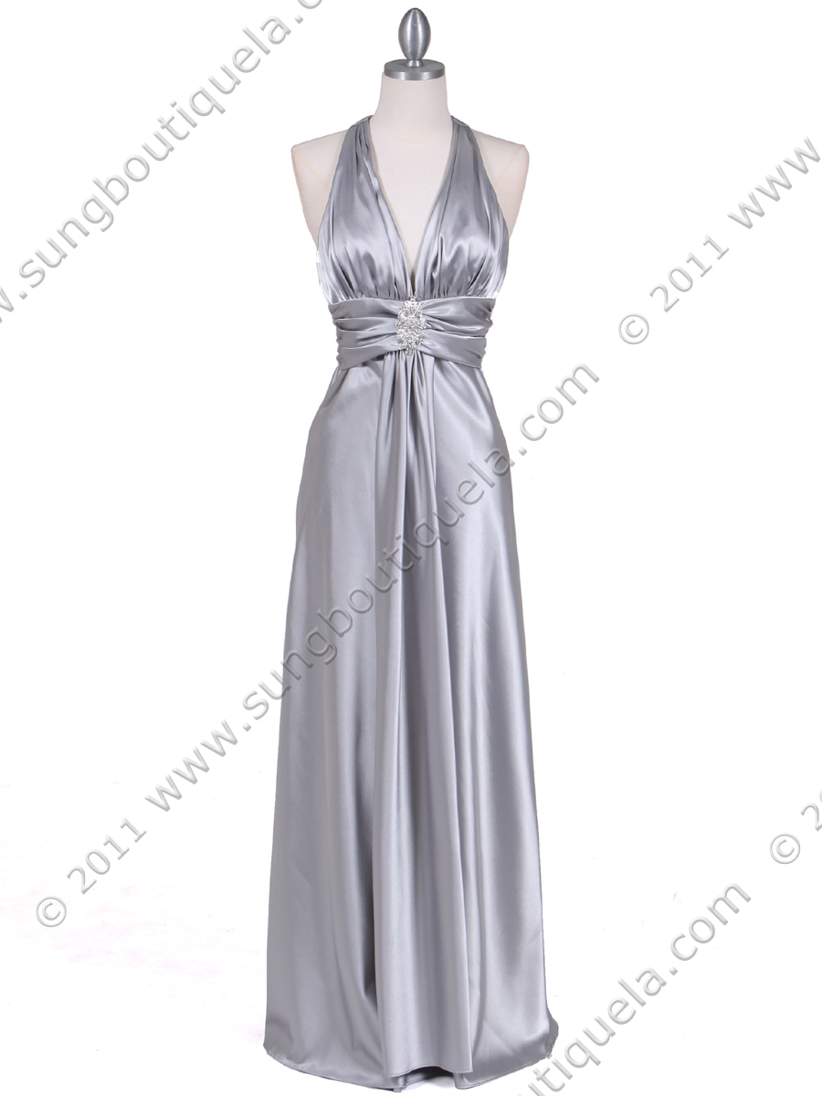 This elegant satin evening gown features halter neck with deep V-neckline. Slim and shirred waist with cascading sash and rhinestone brooch for added elegant. Back center zipper; matching shawl included. Made in USA; 100% polyester.