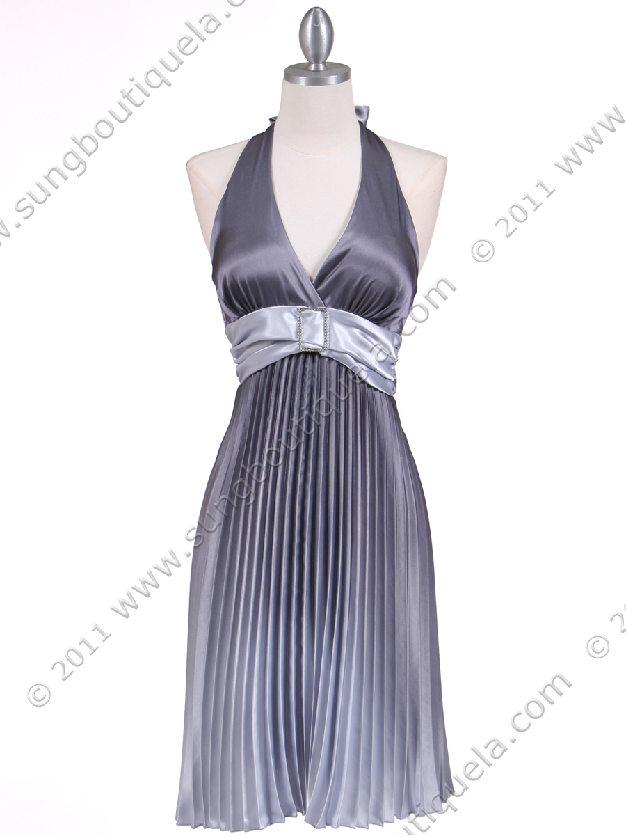 This beautiful two tone cocktail dress features halter neck with deep v neckline. Rhinestone buckle adorn the front. Full, fluid pleated skirt adds a sense of romance. Made in USA. 100% polyester. Back center zipper. Matching shawl included.